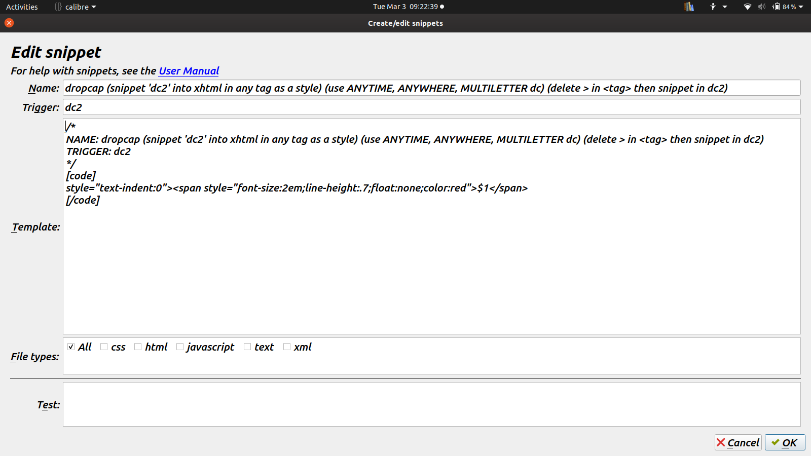 NAME: dropcap (snippet 'dc1' into stylesheet, then type class="dc" in xhtml) (use ANYTIME for single-instance SINGLE-LETTER dc, usually after p in <p>) TRIGGER: dc1 */ Code: