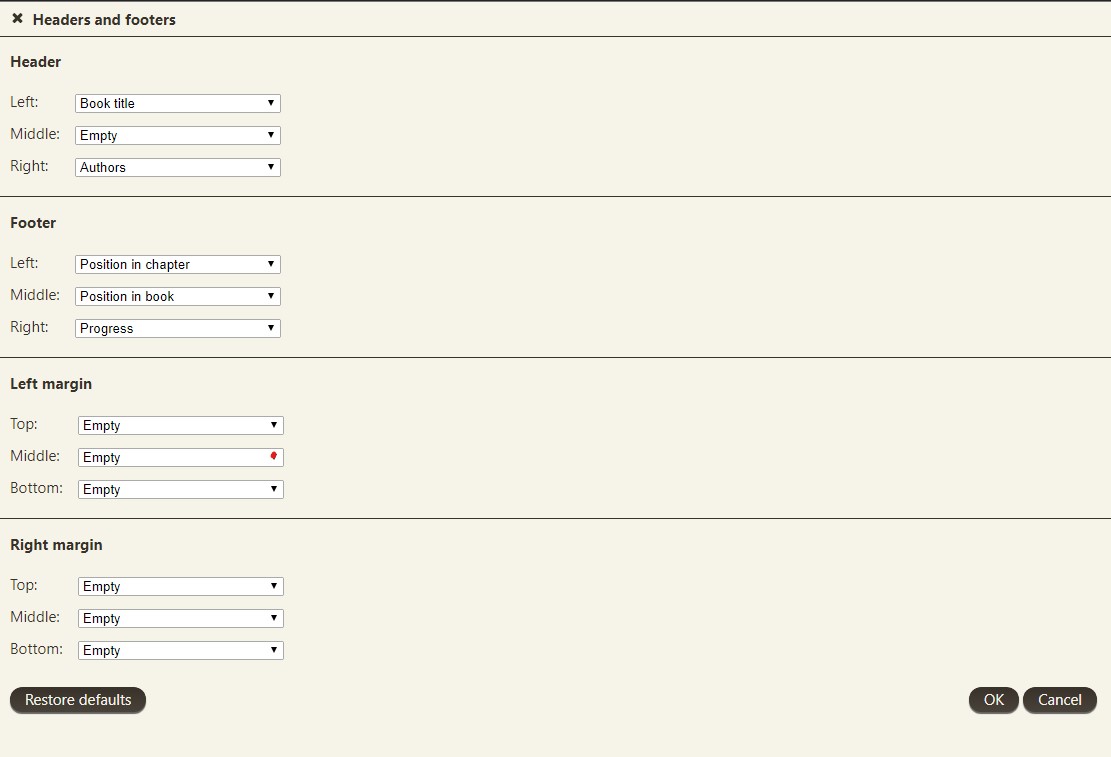 Note the 3 circled items in the footer. The first is clock, the second is position in book (current position/total) and third is position in chapter (current position/total). These are set in the preferences for the footer as seen in the image for the Headers and footers preferences page. |
