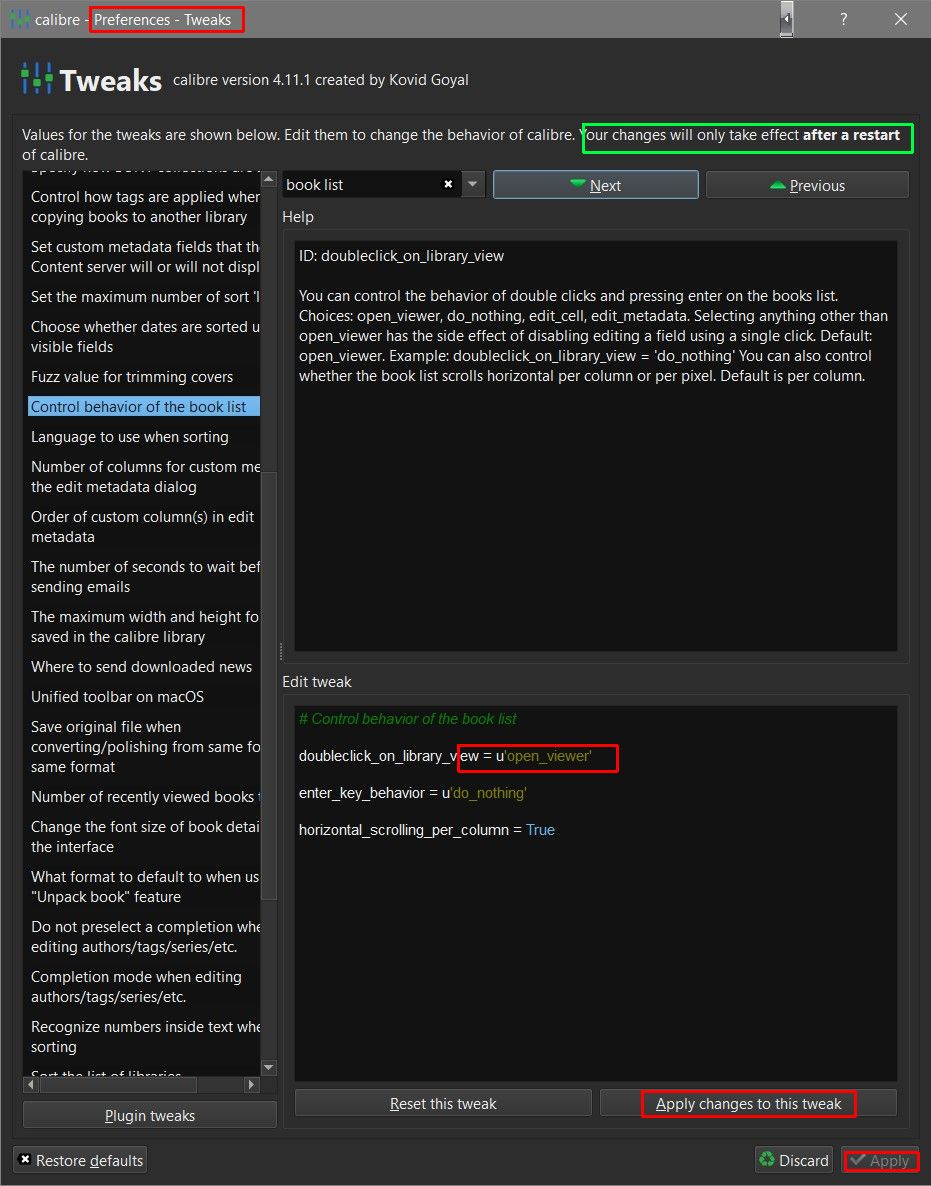![]() You may be the first ARCH user to report the setting being ignored. BTW triple check that there is not a tiny Typo in your tweak But if it used to work for you with older versions of Calibre, it may be another QT issue mouse (Win has touchy mouse clicks)
