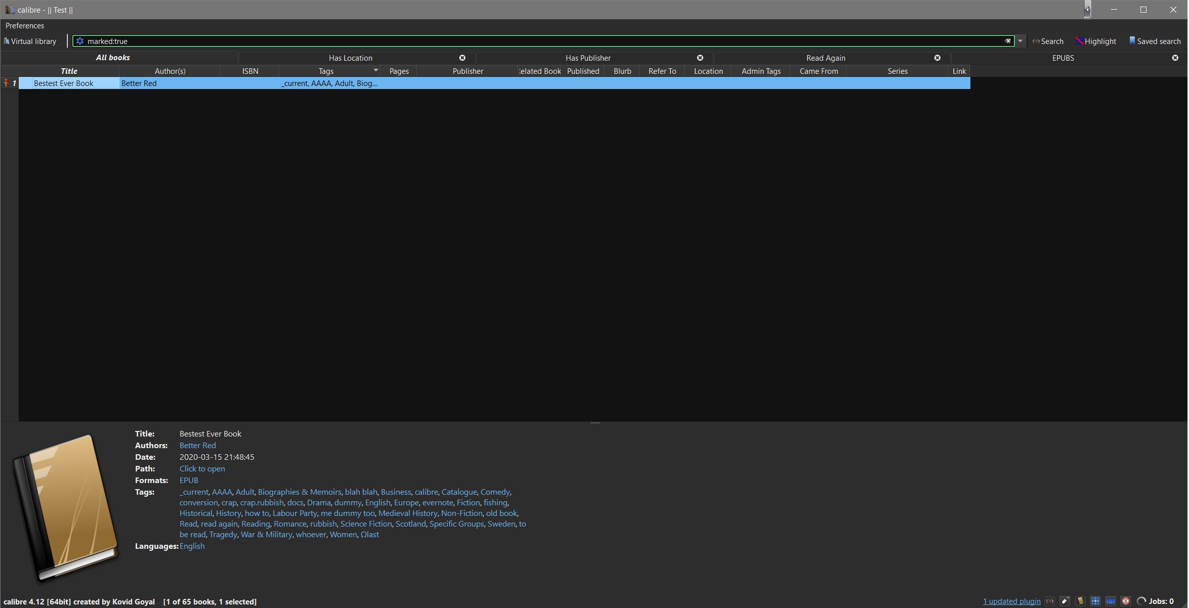 Your friend adds the EPUB to their library, et voila all your tags are in their library. They must leave the book there as a place holder for the Tags, as you probably know you cannot have Tags (or any other category) that are not attached to a book. Tip: use shift click in the Tags editor's Available tags list to select multiple items. @Kovid - just a nitpick: the Add books->Add empty books option (Book entry with no formats) is no longer quite true. BR Last edited by BetterRed; 03-13-2020 at 06:46 PM. Reason: note to Kovid |