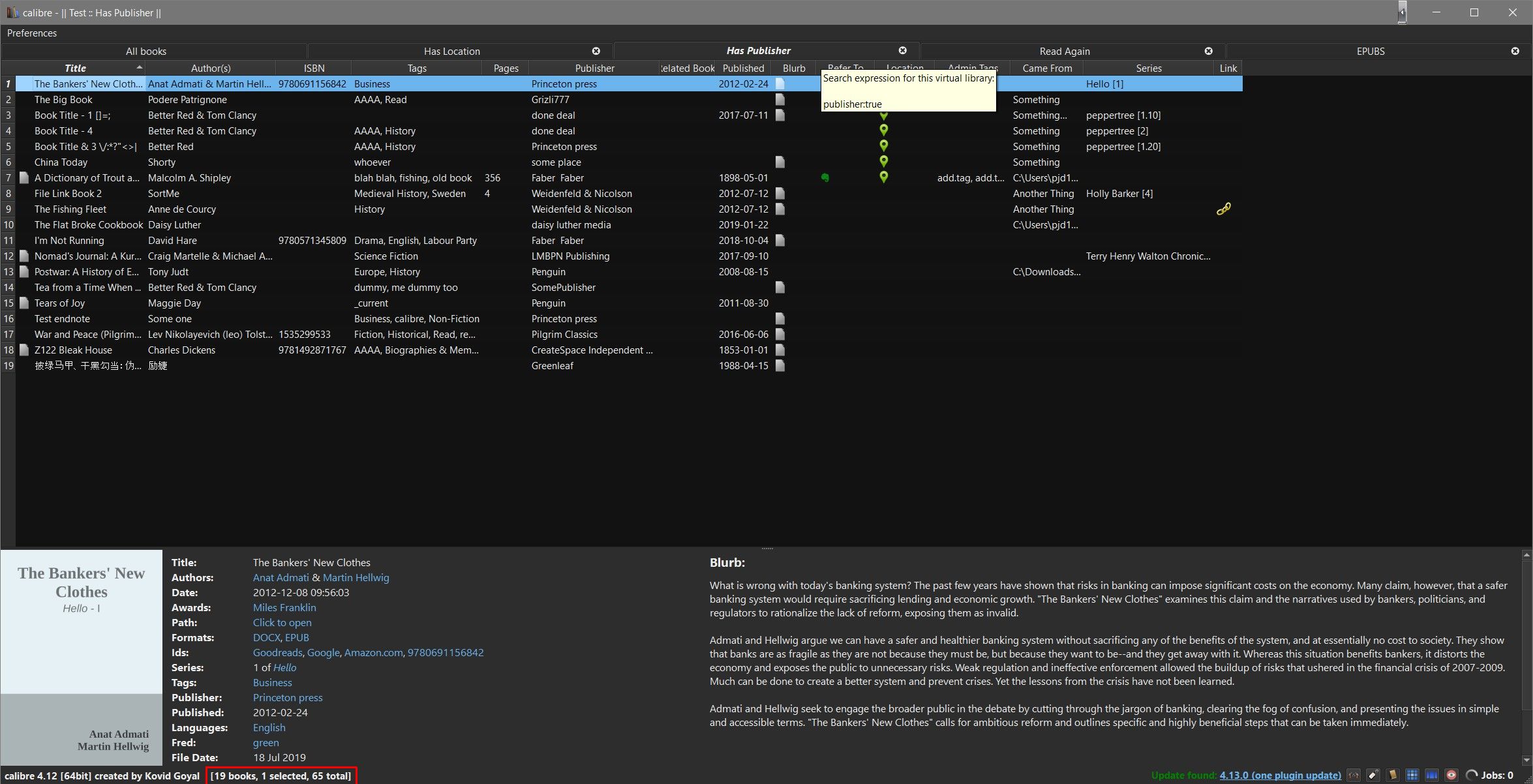 If one has an existing custom column, such as "Finished" for books read, is it possible to edit the column to allow inclusion in the tag browser? I think my problem is due to the "column type" being "date" which does not offer the option of a checkbox to "show in tag browser" as other column types provide. I already have a fair number of books which have the "#finished" with date assigned. Is it not possible to edit this column after the fact? (still using v3.48) I would be most appreciative to be pointed in the right direction by someone in the know. Many thanks, Patricia |