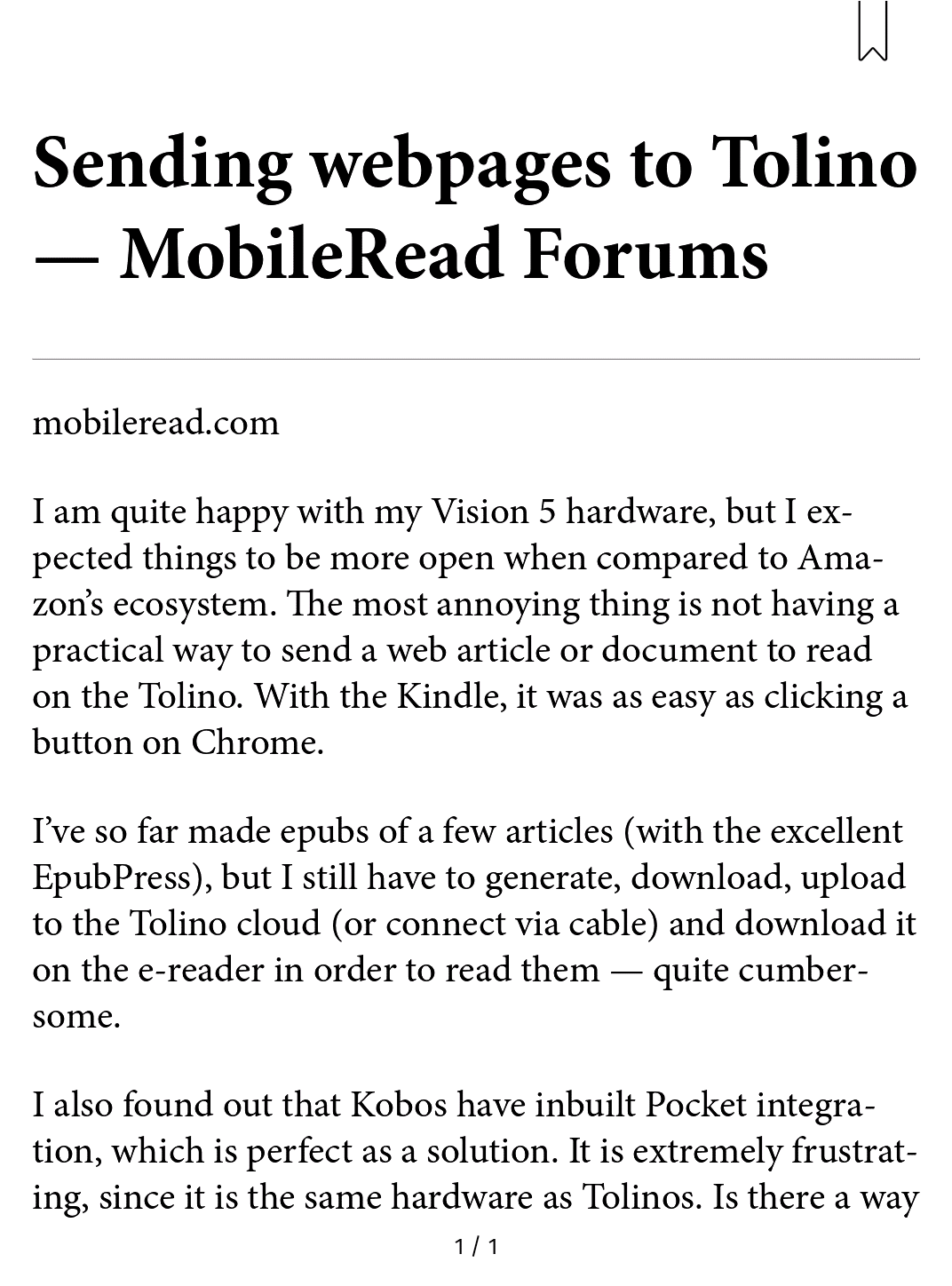 I am quite happy with my Vision 5 hardware, but I expected things to be more open when compared to Amazon's ecosystem. The most annoying thing is not having a practical way to send a web article or document to read on the Tolino. With the Kindle, it was as easy as clicking a button on Chrome...