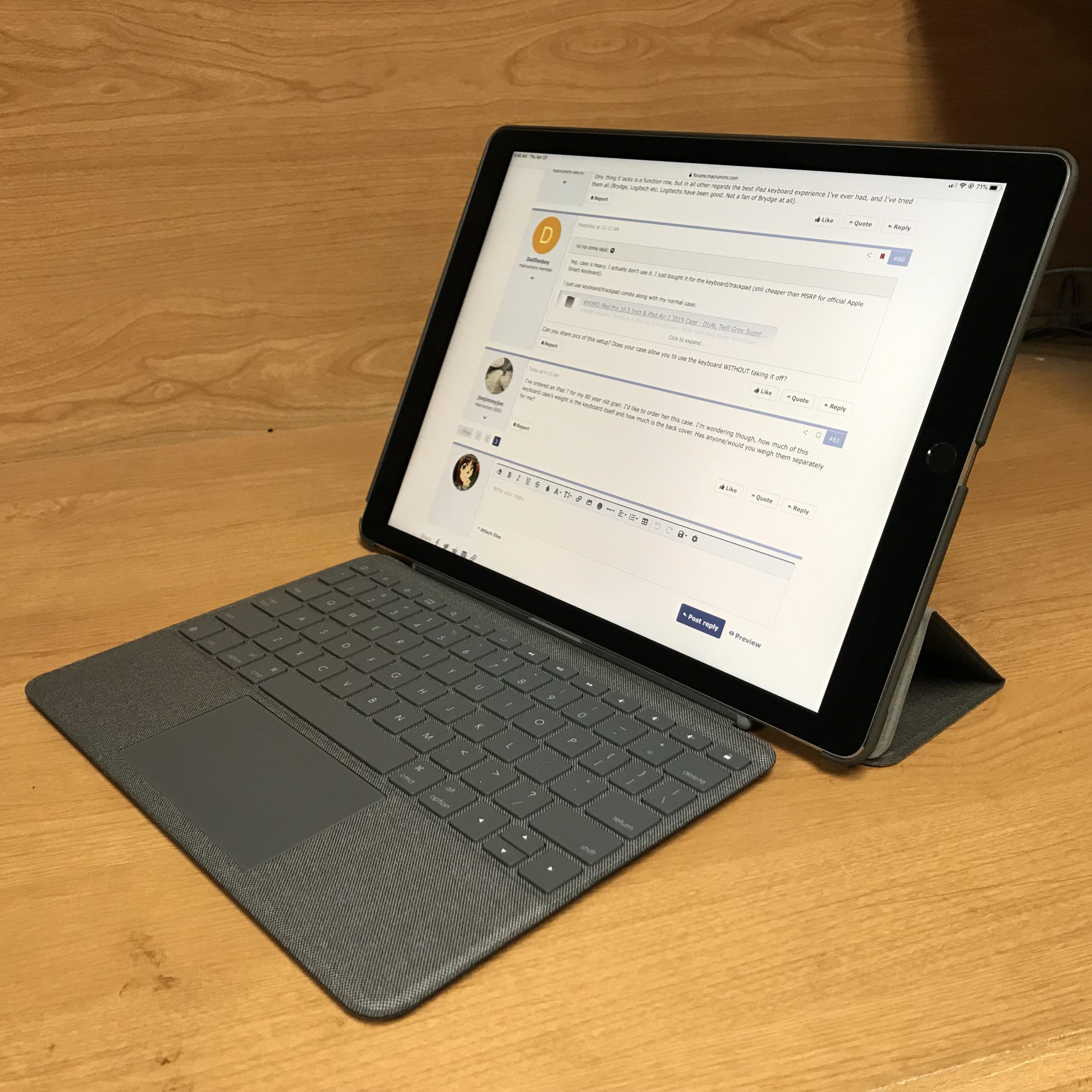 I'm still working and I often find it helpful to use iPads in addition to my dual monitor Windows desktop. I have a Logitech K780 keyboard and MX Ergo Plus trackball that I switch between desktop and 12.9" iPad. I needed something with mouse/trackpad that can work interchangeably with a Pro 10.5, Air 3 and 7th gen without constantly having to tinker with Bluetooth pairing. The Logitech Combo Touch fits the bill nicely. The angle, I can't make it recline more but I can get it straighter by putting Post-It pads between the back shell and trifold cover stand. Don't really need to since the case angle works fine for me on my desk. At home, I just use the onscreen keyboard on the iPad when I need to type something. I'm usually fully reclined in bed with iPad sitting on my tummy or chest so a laptop doesn't really work well in that scenario anyway. Before I got an iPad, I'd often use the laptop in bed and have it fall to the floor with hinge/LCD open when I fell asleep. Talk about a wake up call. Last edited by ilovejedd; 04-25-2020 at 02:01 PM. |