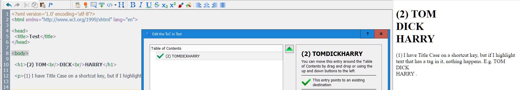 (2) In a heading like TOM<br/>DICK<br/>HARRY, the tags are ignored when making a TOC, so that the TOC entry looks like TOMDICKHARRY I don't understand how your TitleCase works for (1), but it would seem to me (obviously just my opinion) that (2) requiring all TOC entries to be a single line can be limiting. Maybe just transforming tags in a space? Last edited by phossler; 05-13-2020 at 02:55 PM. Reason: Forgot pictures :-( |
