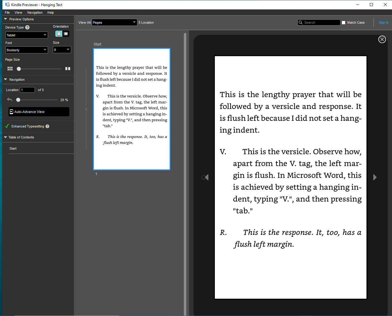 <p>This is the lengthy prayer that will be followed by a versicle and response. It is flush left because I did not set a hanging indent.</p> <p class="hanging">V.<span class="preserve">    </span>This is the versicle. Observe how, apart from the V. tag, the left margin is flush. In Microsoft Word, this is achieved by setting a hanging indent, typing "V.", and then pressing "tab."</p> <p class="hanging italic">R.<span class="preserve">    </span>This is the response. It, too, has a flush left margin.</p> Code: