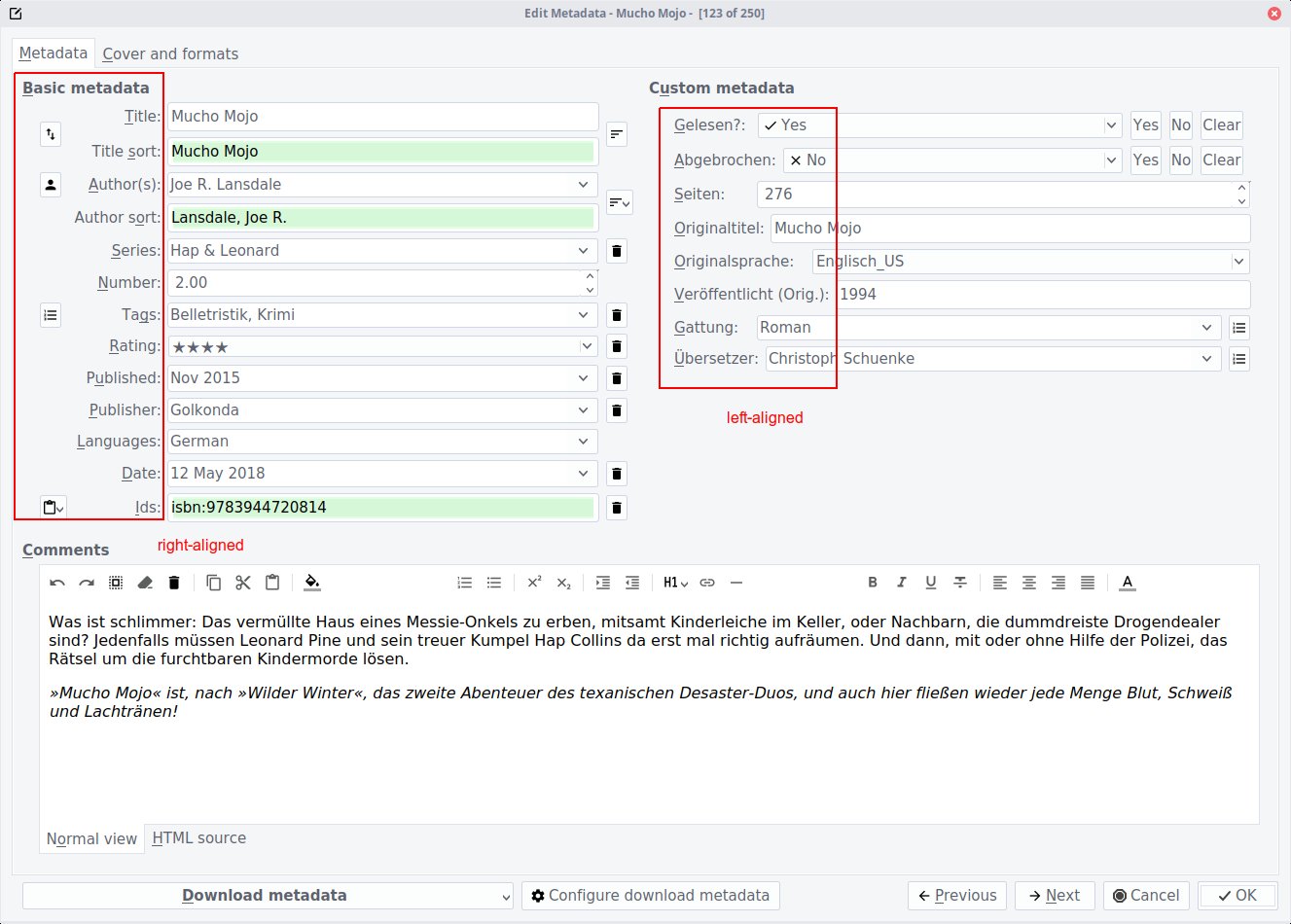 I have created some own columns in Calibre and I'm using the compact layout to edit metadata. The labels for basic metadata are right-aligned, so the content fields have all the same size (that's what I want). Problem: the labels for custom metadata are left-aligned, all content fields have different sizes (see attached screenshot). Ok, it's only an optical not a functional issue, but is there any option to change this? |