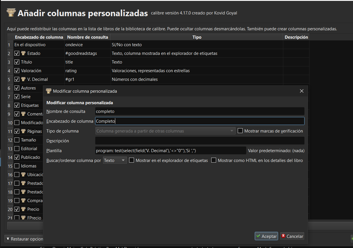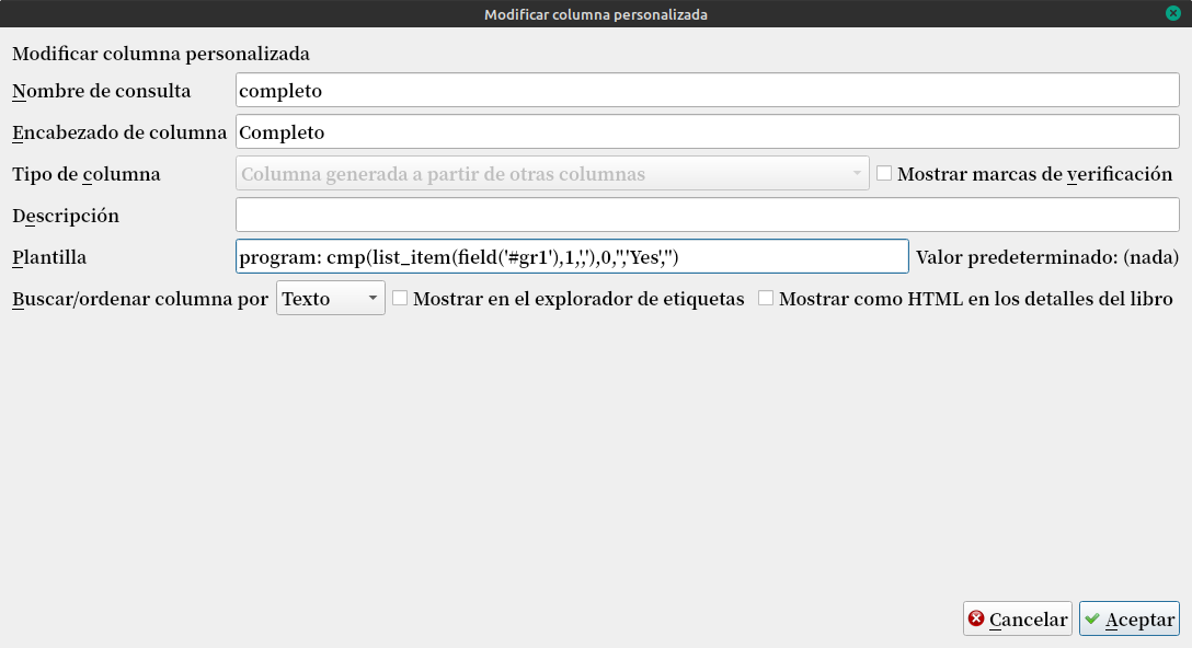 I would like to make a column that depends on it to tell me if all the data in the book is complete, if the decimal column has the column heading "V. Decimal" and the query name # gr1. What should the template be like? I tried with program: test (select (field ('V. Decimal'), '<> "0"'), 'Yes', '') |