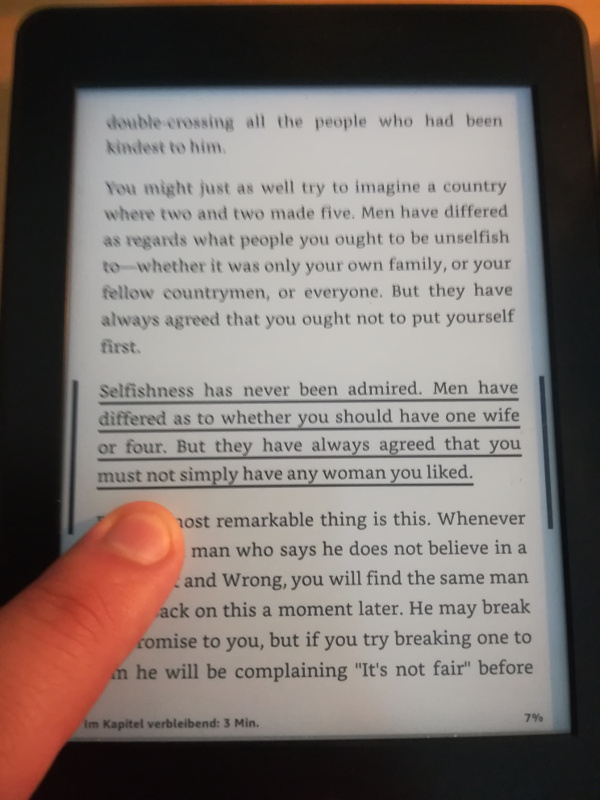 I'm wondering why the marker behaviour of on my kindle devices differ. I have two kindles both on the same firmware (5.12.2). A Paperwhite 2 & 4. The PW4 is jailbroken, while PW2 should still be as amazon likes Kindles to be... However, I really want that marker behaviour I know from the PW2. It's way better to read while marking. Anyone knows how to enforce it? On PW2 it looks like this: on PW4 it looks like this: I definitively prefer the way it's done on the PW2. Where does that setting come from? How can I teach the PW4 to mark like the PW2 does? |