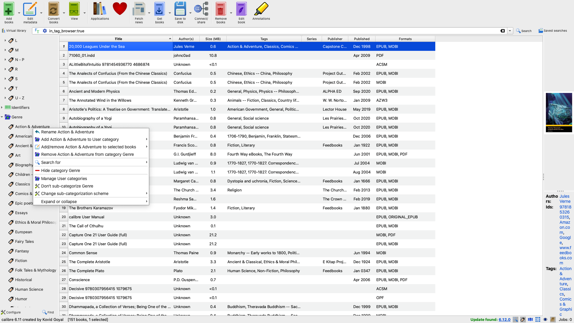 I am lumping a few questions together. I have finished reading the Calibre manual and feel better acquainted with the program. 1) Can someone please explain the concept of Polish? How is metadata used to generate more metadata in a way that is different from searching for metadata (and generating it from) online? Also, I continue to get an error message when trying to use the Polish command with Epub and AZW3 ebooks. 2) What happens when separate book records of the same book that is divided into different formats are merged and then exported? Does Calibre make an automated decision about which format to export or is there a dialogue window allowing the user to choose which file type to export? 3) Where is the "Add subcategory" command located? When I right click within the Tags section, I don't see any such option. [I have attached a screenshot to show my view.] 4) I apologize if this is a stigmatizing question (it's not clear to me if this is a file management question that is being explicitly addressed in the FAQs section), but is it possible to change the default location of the Calibre library to an external drive? (I am concerned about running out of space on my computer.) Or does this qualify as tampering with the program's innate coding? Thanks for the help! |