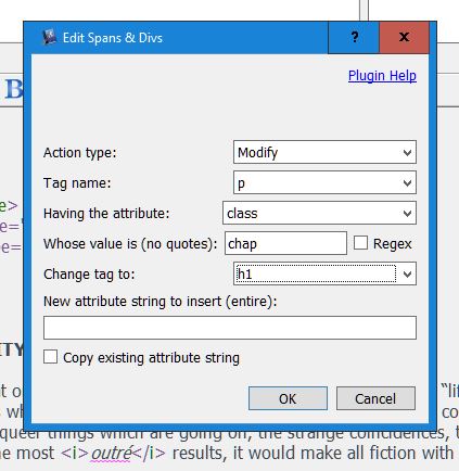 Does this involve some arcane tweaking of a file somewhere ? I have long tried to use the plug-in to achieve the task of converting a classed "p" tag to a "h" tag and have always had to do it by regex. As I see it the only thing you can change a "p" to is a "div". BobC |