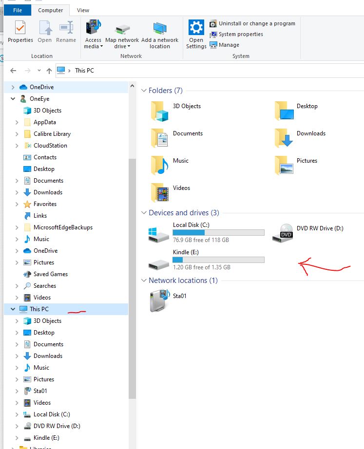 Windows Explorer: is the way you normally find files on your PC. If your Kindle is detected: it will appear on the list (This PC) |