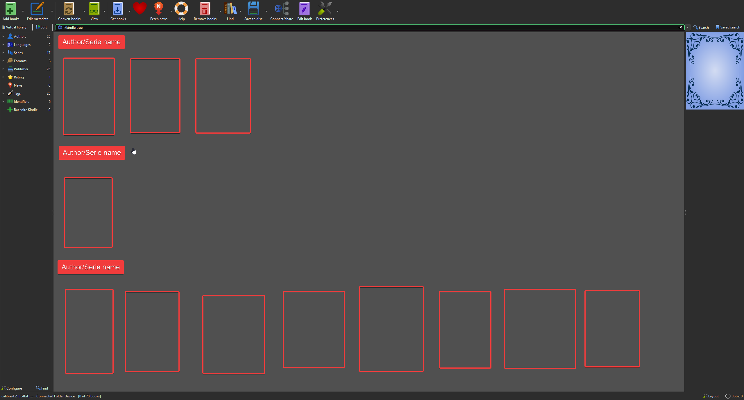 I just wanted to ask if it would be possible to have a grid view based on the authors/series. I tried to make a mokeup of how it should look. I put it under spoiler since it's really huge ![]() Do you think it would be possible? It would make Calibre look way better and polished for me. Last edited by BetterRed; 07-20-2020 at 06:17 PM. Reason: Oversized inline image |