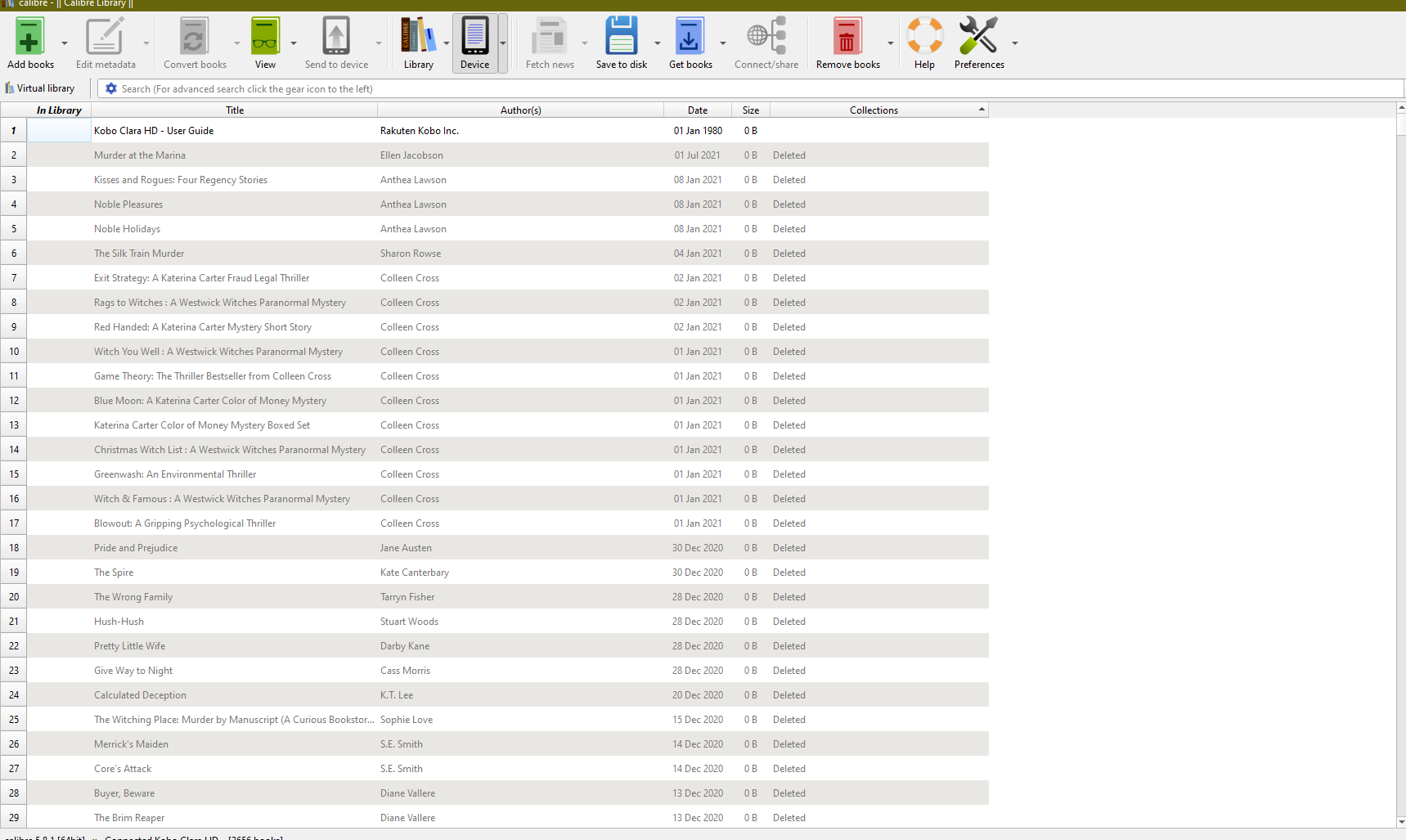 For the first time in a very long time, possibly ever, I plugged my Kobo into Calibre and looked at the device before sideloading books. And there were nearly three thousand books in a category labeled as deleted.