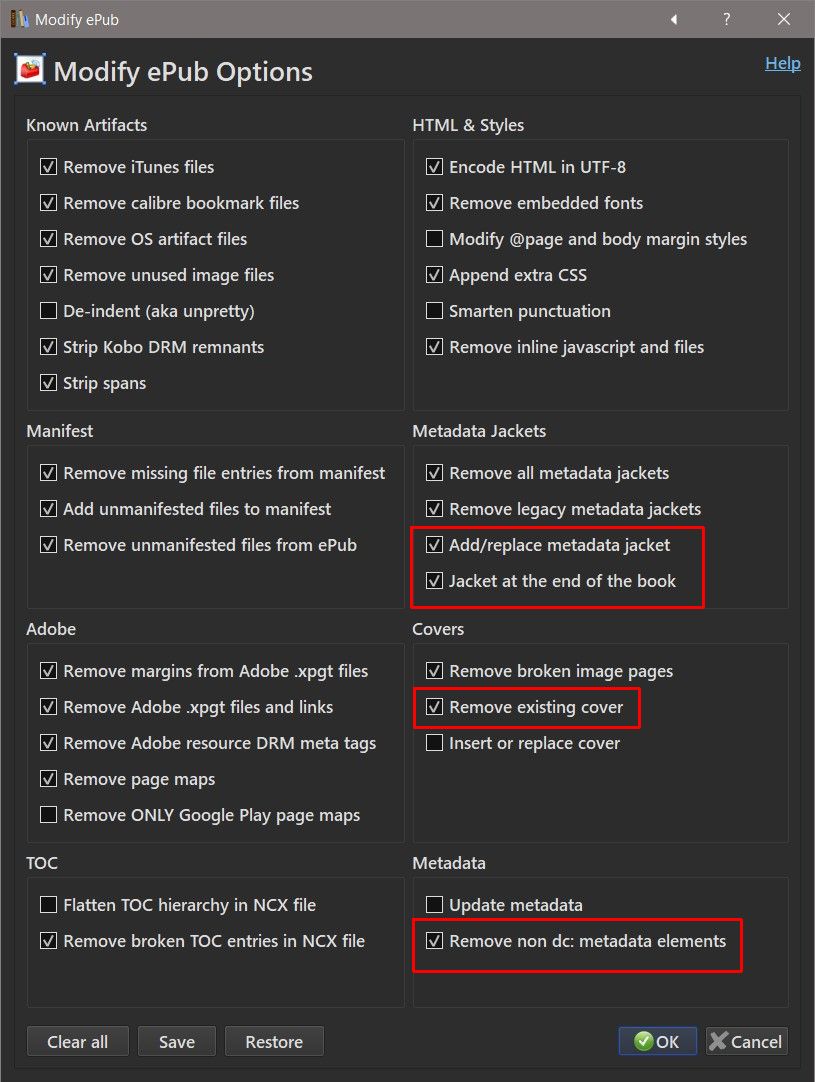 epub output: No default cover andepub output: No SVG cover docx input: Do not try to autodetect a cover from images in the document My guess based on no specific knowledge is that you want "No default cover" and "Do not try to autodetect ...". I further suspect that "No default cover" is the answer. In addition to setting the options in Preferences, be sure to check the options when you are doing the convert as these override the general options set in Preferences and are remembered the next time you convert the book. |