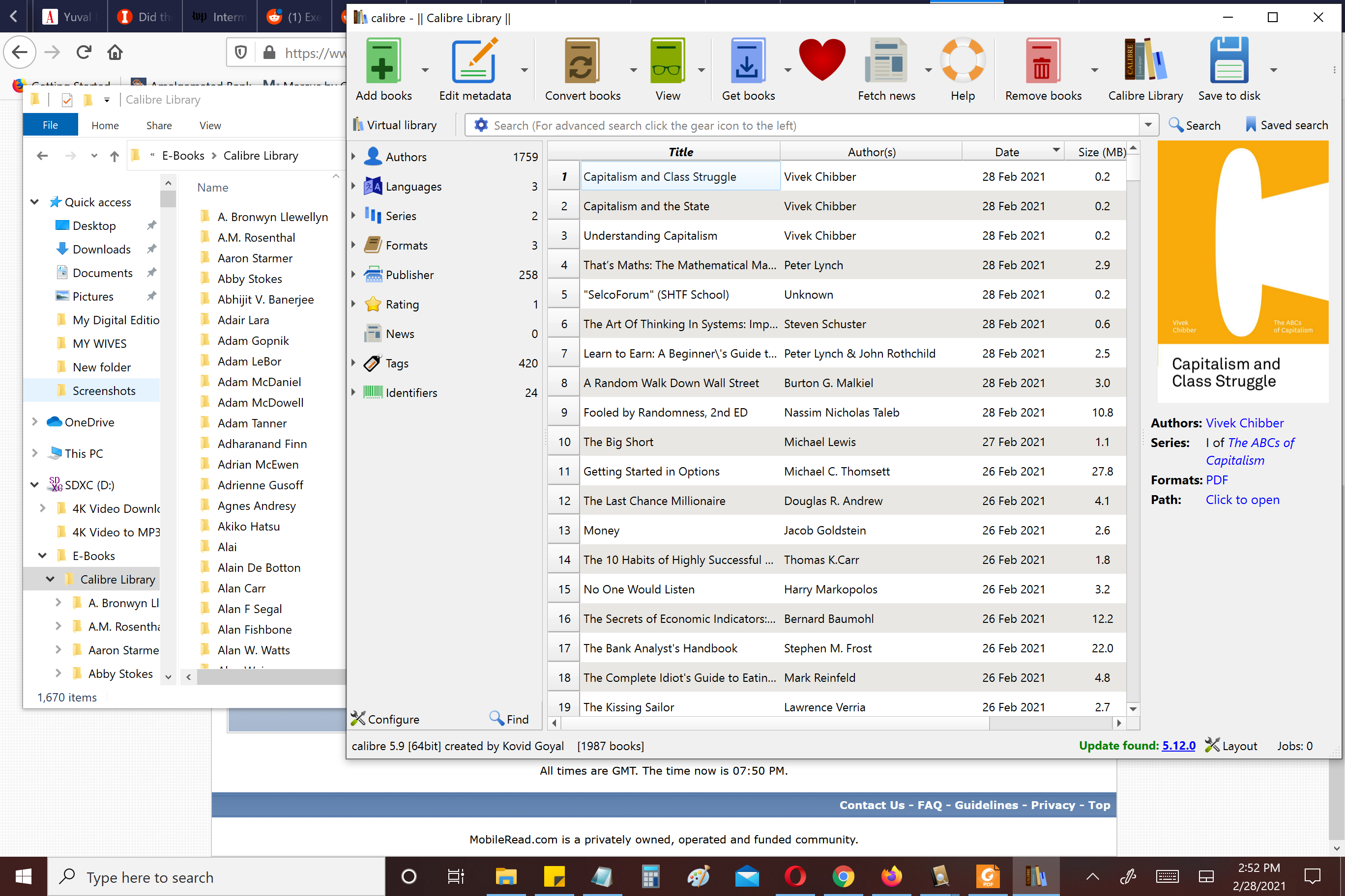 I followed the instructions given at https://www.mobileread.com/forums/sh...d.php?t=140376 to the best of my ability; they weren't very clear to me but basically I clicked on the large "Calibre Library" icon on top and just changed the directory. Once I was in the source directory, I selected all the ebooks with CTRL+A, right-clicked, and chose some copy function presented in the context-menu...in the resultant dialog-box, I checked "move" instead of simply "copy" and that's that. Incidentally, Windows 10 shows my merged/consolidated Calibre Library directory to have only 1,670 items in it whereas the Calibre program itself lists 1,987 eBooks here. Problem? Last edited by BewilderedUser; 02-28-2021 at 03:54 PM. Reason: added another screenshot |