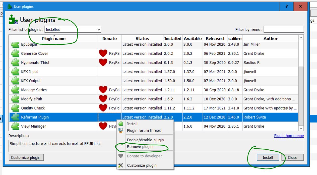 Filtered by "Installed" Highlighted the PI The main button was still labeled [Install] Finally figured the right-click and did what needed to be done 1. Changing the button caption depending on the action might eliminate some confusion. If an Installed PI is selected, then [Uninstall]. If an Uninstalled PI is selected, then [Install] 2. [Customize] is disabled (dim) when an uninstalled PI is selected (good), but is always enabled if an installed PI is selected, even though Calibre knows that there is no customization available. Maybe it should always be disabled unless there are customizations available |