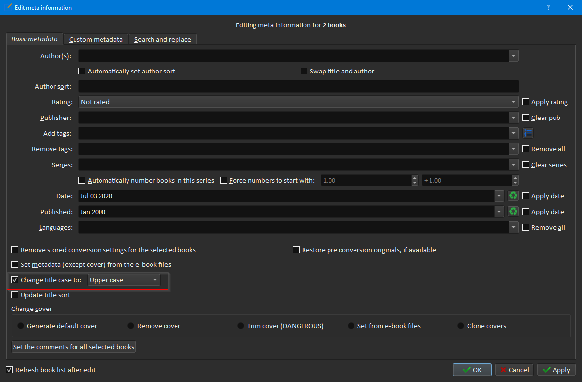 Everything is working great except the Search and Replace function when working in the Edit Metadata In Bulk. Someone previously helped me with this quite a few years ago, but I can't seem to find the thread on any of my posts. All I am wanting to do is select all books I want to use in the Edit Metadata in Bulk, go the Search and Replace tab, select a command "AUTHOR UPPER" and all authors' names be changed to uppercase. I have a hard time seeing the names if they are not in all caps. Any help would be greatly appreciated. For some reason I can't attach a screenshot I have saved on the computer as an example to help explain what I am looking to do.