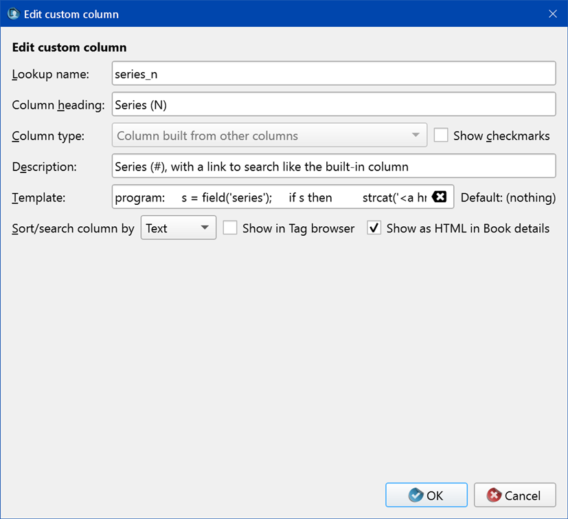 "Author(s)" instead of "Authors": Since the vast majority of my books have only one author, I wanted to display the column header / book info label like this. Ditto for "Formats" and "IDs". It was accomplished by editing a translations template (*.po) file and setting the CALIBRE_TEST_TRANSLATION environment variable. (See calibre's "Get involved" page for how to use translations.) Display format for Series: I wanted the Series to display as "We Are Bob (1)" (for example) in the book details panel, rather than "1 of We Are Bob". I wanted to keep the ability to click on the series to search for all books in the series. This was accomplished with a custom column (see attached image) using a template: Code:
