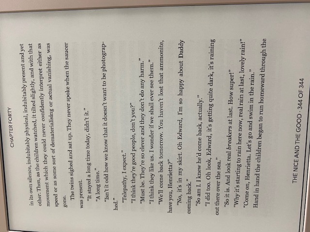 This picture illustrates why avoiding widows and orphans is so important to me. And it also looks as if (apart from that issue with the book I posted about earlier) the config file edit has resolved my issues. Previously when I read epubs in this two page layout, one side was usually shorter than the other, and now, it just looks perfect.