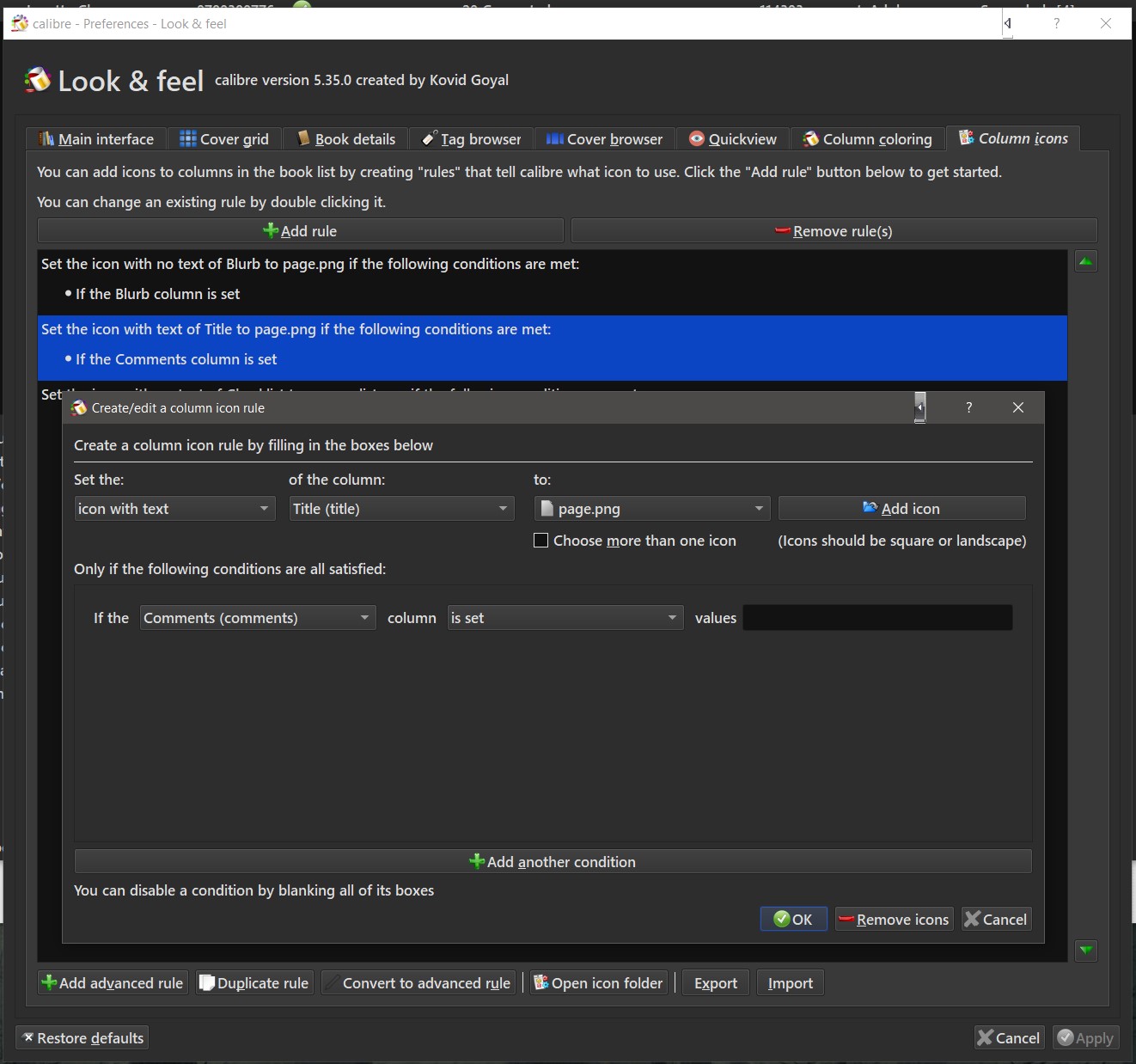 I have a couple of follow up questions if you don't mind: 1. Is there a downside to keeping the comments after copying them to #blurb? I ask because I use the OPDS content server to transfer books to MapleRead and the comments show up when I am browsing MR on my iOS devices and I think if I deleted the comments, then they wouldn't show up while using MR. 2. Is there a repository of custom icons that forum users have made for sharing? Last edited by slantybard; 01-31-2022 at 02:01 AM. |
