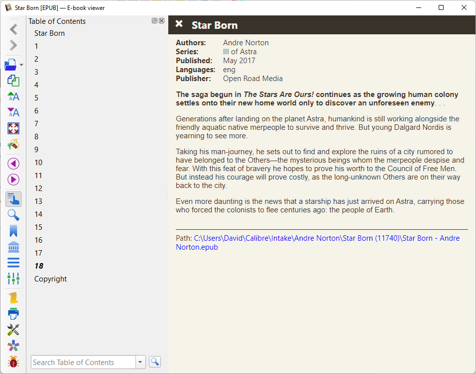 Opened Calibre. Pressed the icon for the card - on the top line of the window. Got a list of books. I presume these are on the card in the tablet. Pressed ESC. Didn't do ANYTHING in the Calibre window. Double-clicked a book. This brought up a e-book viewer. Hit ESC. STILL don't see any "View metadata" OR "colored star". I'd put a picture of the e-book viewer in here, but I don't see an obvious way to send it from the computer. If there's some OTHER "Calibre Viewer" I have no idea what it is or where it is. |