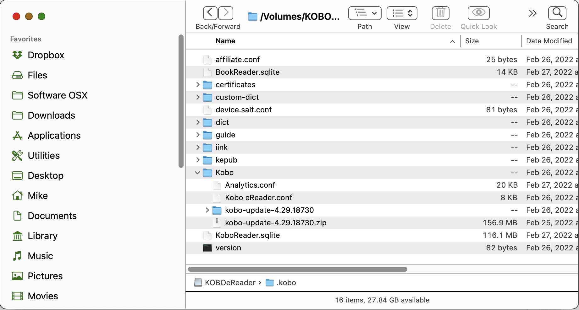 Thanks for the help.I tried the Kobo desktop application and it basically forced me to either open WiFi or download the files via the web. Could not find a way to replace the firmware update. Attached is a screenshot of my /Volumes/KOBOeReader/.kobo folder. Did I insert the 4.30 update files in the correct place? Restarting with WiFi and Bluetooth off and and updates disallowed in the preferences still results in booting into 4.31