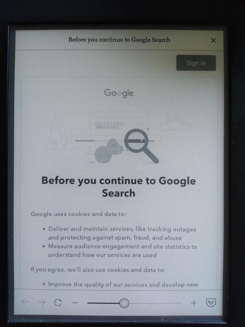 I have had Clara HD for about 18 months. Google did used to work fine & this dictionary/web feature worked fine, but recently (few months) I kept seeing a cookie page, so I changed my beta browser home preference to use duckduckgo & that has worked well when using the browser directly. However, the built-in search, in book reading, is only google. Wikipedia & duckduckgo work fine, its just google I have this problem with. After I posted here initially I then started getting the Google 'upgrade browser' message - i dont know if this was because I had failed the cookie questionnaire to their liking. The cookie page shows a long page of google terms & conditions & you have to either 'sign in' or 'customise' - customise give a long page of opt-in / opt-out options for adverts & sharing data etc etc - I couldnt get through this task because the check boxes etc didnt work on the page using Clara. This morning the "upgrade browser" page I was stuck with yesterday has gone back to the cookie-page. (I think they blacklist your IP if you fail the cookie page answers ) This time I chose to log-in with Google & then the search went through normally. However, if I search for another word, even immediately, I have to go through the process again of logging-in or answering the cookie questions. I moved from Japan to the UK a few months ago, im not sure when the problem started but it was certainly not the case in Japan. I dont have VPN but I am using my mobile phone as a wifi hotspot. Last edited by RodRiquez; 02-22-2022 at 05:52 AM. |