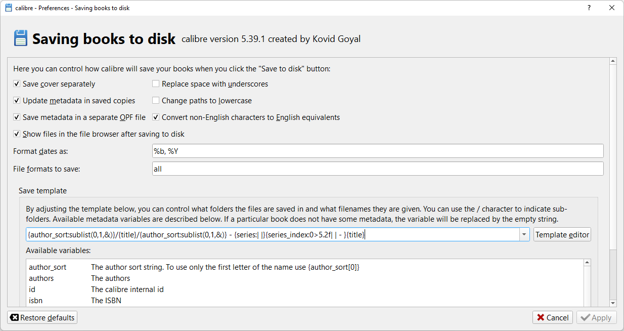 As far as I know, the calibre library files will never show the series/series index as part of the filename since that should be stored in the metadata for the library. When you save to disk or send to device, there are templates to control the output filenames. I've attached an image of what I see in my calibre library and in the library folders when I converted epub to mobi. I've also attached an image for the save to disk template and the send to device template (the one in the device driver which overrides the default template when connected to a Kobo device). When I did a save to disk using the following template: {author_sort:sublist(0,1,&)}/{title}/{author_sort:sublist(0,1,&)} - {series:| |}{series_index:0>5.2f| | - }{title} (use the first entry in author sort for the subdirectory, then the book title as a subdirectory and then the first entry in the author sort - series_seriesindex - title, I see the following books in those directories. Sterling, J. - The Perfect Game 01.00 - La partita perfetta.mobi Sterling, J. - The Perfect Game 02.00 - La svolta di gioco.mobi Sterling, J. - The Perfect Game 03.00 - La partita piu dolce.mobi Basically, either your save to disk or send to device template is garbage or your metadata is garbage. Last edited by DNSB; 03-20-2022 at 10:20 PM. |