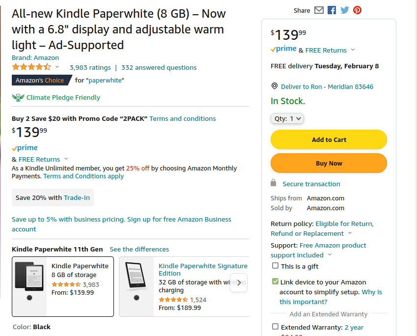 As a Kindle Unlimited member, you're qualified to receive 25% off an ad-supported Kindle Paperwhite when you purchase with monthly payments. The all-new Kindle Paperwhite features a 6.8” display and thinner borders, adjustable warm light, up to 10 weeks of battery life, and 20% faster page turns. Yet I can NOT find it to buy.     Last edited by Barbara1955; 02-02-2022 at 04:24 PM. |