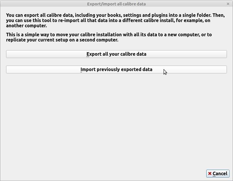 I am running Calibre on a Mac and want to switch to Linux. Installation of the Linux version went fine, also I could copy the "Calibre" folder from the Mac to the Linux machine to have my settings also in the new computer. I then exported all Calibre data from the Mac but could not import them into the Linux Calibre as there is no top menu bar like the Macs have and thus no according option. Also: The one book Calibre comes with, is the Calibre introduction. When I opened it in the Linux Calibre, the book's metadata did not show the fields I added manually on my Mac version. My two questions would be: How can I import my books into the Linux version and will the extra fields I added show up too? Thanks for helping! |