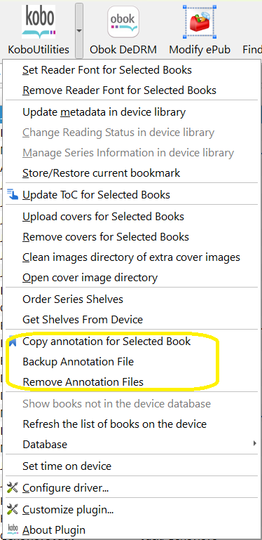 Plug your Kobo your computer, in Notepad++, open the .kobo\Kobo\Kobo Ereader.conf file on the device. The file has multiple sections, with title in square brackets, [ ] Find the [Feature Settings] section and add this line. ExportHighlights=true So it will look like this when you're done. [FeatureSettings] ExportHighlights=true MyWords=true Save the file. eject and unplug the kobo. I forget if you have to reboot it for this change to take effect. But now when you long press a book in your ibrary, (or open a book's ... menu), there wil be an option to Export Annotations. That will export your highlights into a text file. |