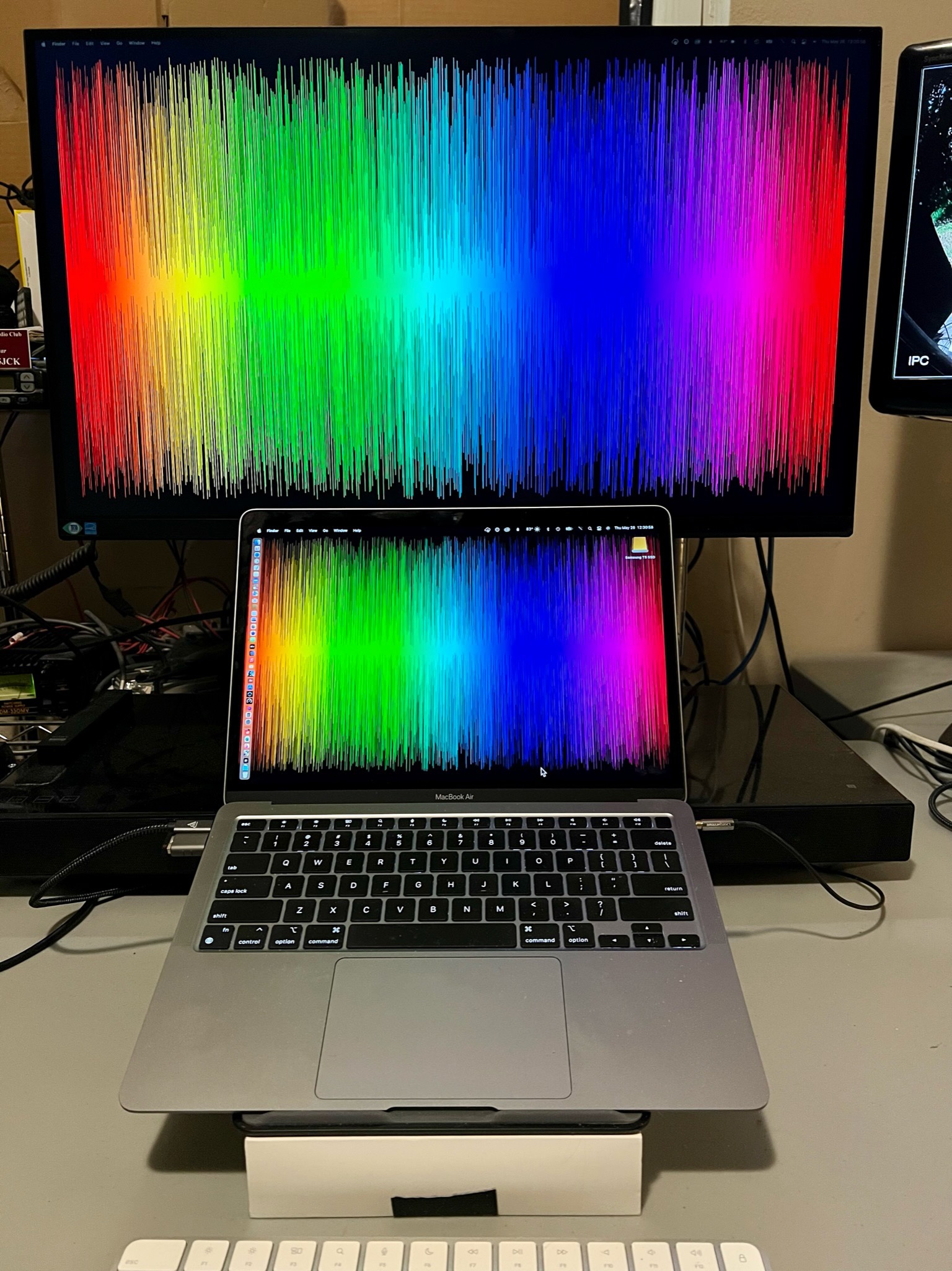 Anyway, the Samsung fit the bill right out of the box without having to calibrate. And at $400 it was a bargain. The attached iPhone photo shows both the Samsung monitor and the MacBook Air M1 display with the same color spectrum wallpaper I created. They both look nearly identical. The monitor is attached via HDMI cable to my Anker 555 USB-C hub which is then attached to my MacBook Air M1. The monitor works well with HDMI. It can also be connected via DisplayPort or USB-C, but I chose the HDMI method because it was easier and in this case works just as well as the other two options. And in case you don't have a 4K monitor, be prepared for Apple's scaling and downsizing routines. You can use the monitor in 3840 x 2160 mode, but the text and UI elements will be too tiny to read without binoculars! So I set it up to use 2560 x 1440, which Apple then scales 2x to 5K (5120 x 2880), but since that is larger than the number of pixels the monitor has it is then downsized to 4K (3840 x 2160). Confused? You should be if you never encountered Apple's somewhat confusing world of Retina displays! But in an abbreviated explanation, the science folks claim that the best resolution size for the average person with 2020 correctable vision is not 4K but QHD (2560 x 1440) on a 27 inch monitor. That keeps the text and UI readable and gives a pleasant sized screen image. Apple takes that science and scales the output image up to 5K then downsizes it back to 4K and you wind up with a readable interface with 1.78x sharper image than if you viewed it on a 27 inch QHD (2560 x 1440 monitor). Okay that pisses off a lot of folks, but it actually works. BTW, that expensive Apple 5K monitor isn't using a 5K image, it is scaled up to 5K and you get a QHD (2560 x 1440) image with 2x more sharpness than a 27 inch QHD monitor, and that is true Retina without downscaling. ...... Last edited by OtinG; 05-26-2022 at 03:32 PM. |