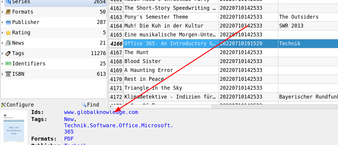 um deine Quelle zu verlinken kannst du das Feld Ids benutzen. Hier ein Beispiel (ich habe eine englische Calibre-Version): 1. Metadaten bearbeiten und dann unter ID z, B. als Identifier url eingeben und anschließend die Adresse. url:<https://www.Adresse.com> Beispiel: 2. In der Übersicht der Bücher kann man dann auf die ID draufklicken. |