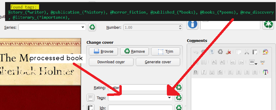 I need help because my code only contemplates the search in a single book and what I want to configure is:** Run the code on selected books from my library (books_ids). ** Found tags are added to the metadata. ** Add a verification tag confirming that the book was processed. The truth is that my knowledge of python is very poor, I only learned about regular expressions thanks to Calibre. Code: