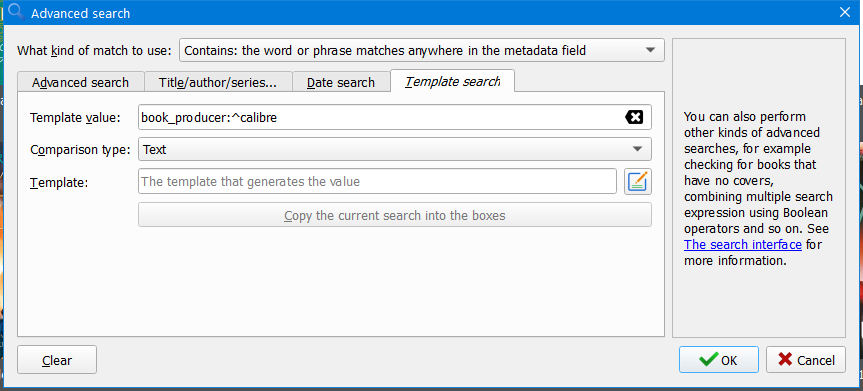 I'd like to do a template search for """book_producer""" containing "^calibre" with (formats:#=1 and formats: pdf). As shown in Calibre manual, that publication metadata field is available: This thread provides some examples (https://www.mobileread.com/forums/sh...d.php?t=347884) however i couldn't figure how to do write that query. Screenshot below shows what I tried, but that was just guesswork: Any help is appreciated.