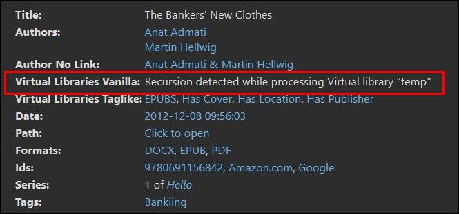 It happens when I start calibre in the Test library or switch to it. As soon I select another book the problem goes away, i.e. VL Vanilla show same content as VL Taglike except its white non-clickable text. Screenshots of VL Vanilla column and temp VL definitions attached. @chaley - I can PM you the Test library database if you're interested, I don't regard this as a bug because it's not a real world scenario. Win 10, Calibre 6.7.1 BR PS : I did a database restore - glitch persists Last edited by BetterRed; 10-24-2022 at 06:30 PM. Reason: PS added |