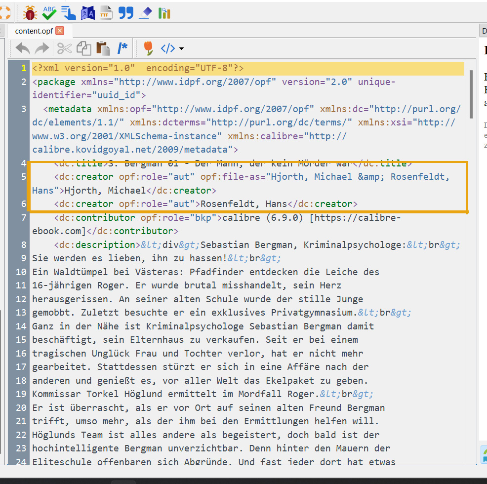 baseline: pc win11 - calibre 6.10 - Tolino vision6 software 16.0.0 I have different books, written by more than one author. In the calibre metadata there is a field called "author(s)" which is filled with the names for example "Hjorth, Michael & Rosenfeldt, Hans" and exactly like the specification of the publisher and written in order on the title of the book. and the metadata is embedded into the book-metadata (attached picture). If I sort the list of books with calibre, it will appear with the character "H" - "Hjorth, Michael". And this is what I want, because it is the right order. If I send this book via usb to the tolino reader, the same book with the same metadata will appear with the character "R" - "Rosenfeldt, Hans". And this is not what I want. Maybe there is a problem with the display of the metadata in the html-format, because if you look to the picture you will see the tag "creator" twice. and therefore mybe the Tolino-system takes the second entry for sorting. But in my opinion this is not correct. what can I do to get the same alphabetic sorting with my ebook-reader which I have with the pc and calibre. Thanks for the solution or any idea to find a solution. |