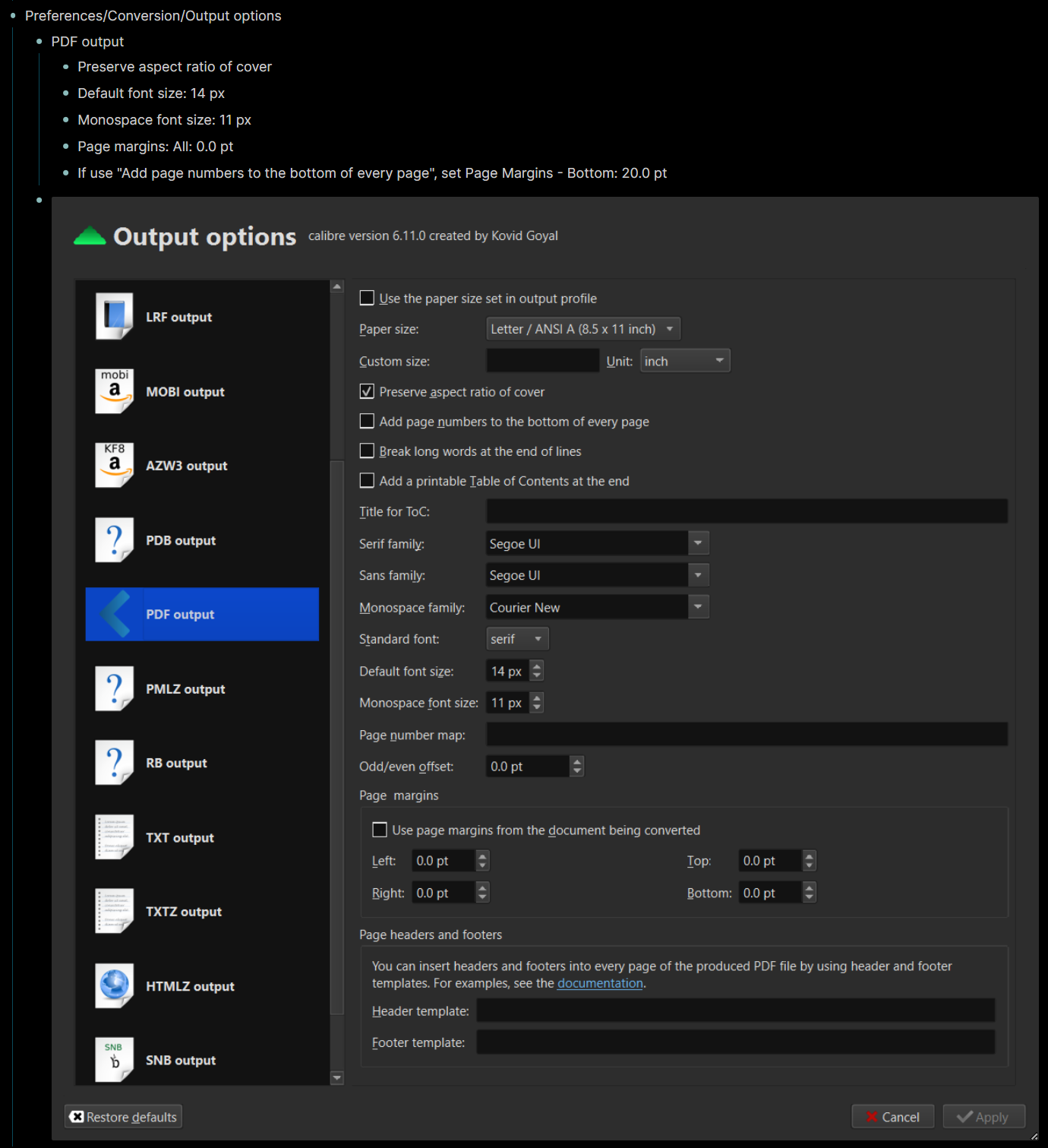 The epub and the converted pdf files can be found in this link: https://drive.google.com/drive/folde...usp=share_link The examples of blank pages can be found at these pages in the PDF file. p. 14 p. 44 p. 58 I think it's because how I set up the conversion profile (please see the attached pictures). I have 2 questions: - Any explanation on why I got those blank pages and how I can adjust my settings in Calibre to remove them? (other than deleting the blank pages in the PDF file manually). - The settings I used work well for me with text-heavy EPUB file, and I have changed these settings in the Preferences. But every now and then I ran into some conversion issue such as this one. When this is the case I want to revert back to the default setting. However, it is every tedious if I click "Restore Defaults" on all settings and then have to apply these settings again for a new book. Is there a way I can back up these settings, restore defaults, and then import the backup settings? Or is there a way to set up multiple export profile in Calibre? Thanks a lot for your help! |