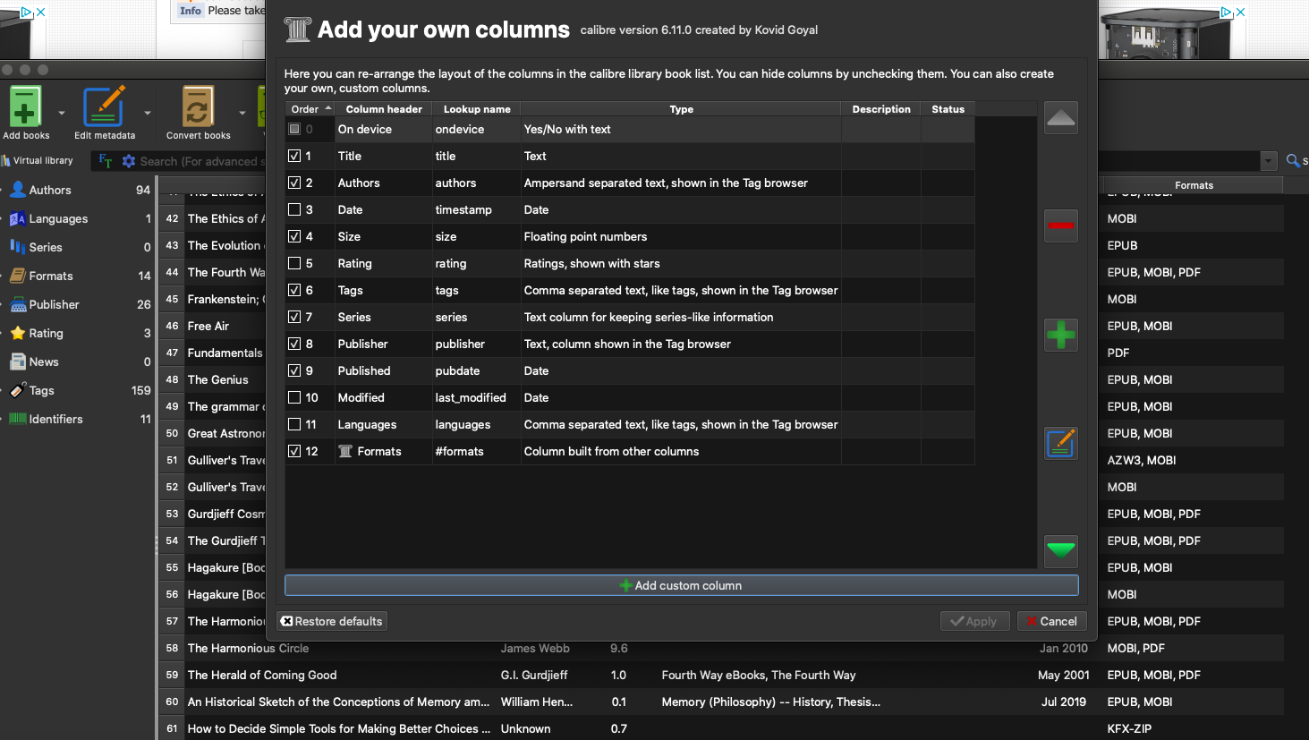 Can a new column be created to show the ebook format? If so, what is the process for doing so? I realize that there is a default filter in the sidebar for format types, but I am looking for a way to better integrate this variable into the main screen of Calibre as a proper column.