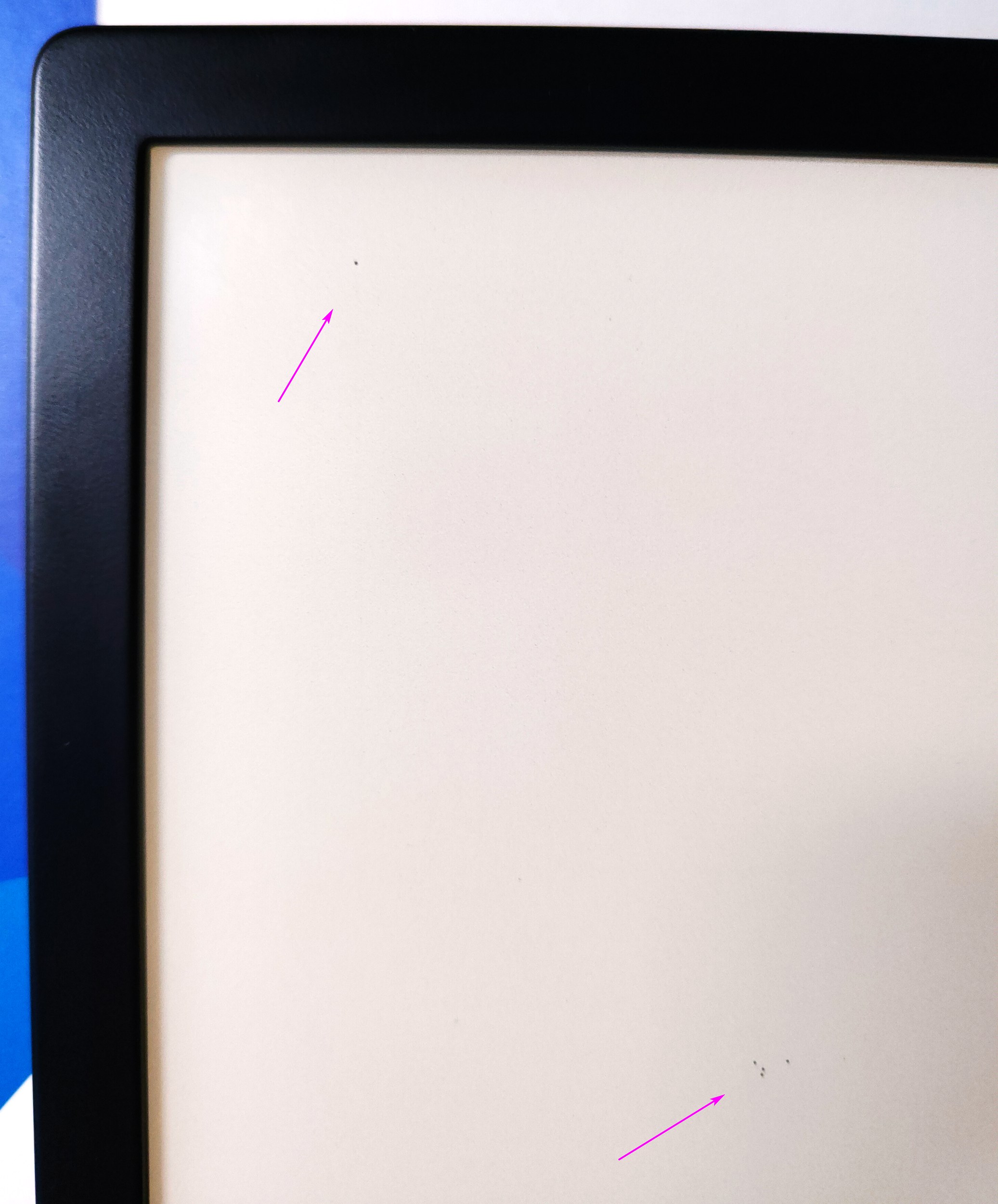 I wiped the screen with alcohol and reflashed the latest firmware version (which was already installed and clearly isn't the issue here). It didn't solve anything, but later that night I read for an hour without any problems. The next morning the touches returned. They are easy to spot in Sketchpad (attached photo). The most obnoxious is top left spot, which is being triggered 10 to 100 times per minute. There's also a cluster of 4-7 spots in the center. Searching the forum I have found a few threads from 2018 about Aura 1st – disassemble and clean everything 2nd – USB connection / PSU issue (not applicable) 3rd – return to seller (I'm not from NA, so shipping is costly). What should I do about these touches? The tragic thing is that this is the 4th Libra 2 I've bought and 3rd to have issues/defects. Previous two had spots on the left side where backlight was shining through (attached photo). And one was seemingly fine. Is this the quality one can expect from Kobo? I wouldn't really care had I lived in US with the access to easy returns, but it's a bit more expensive where I'm from. |