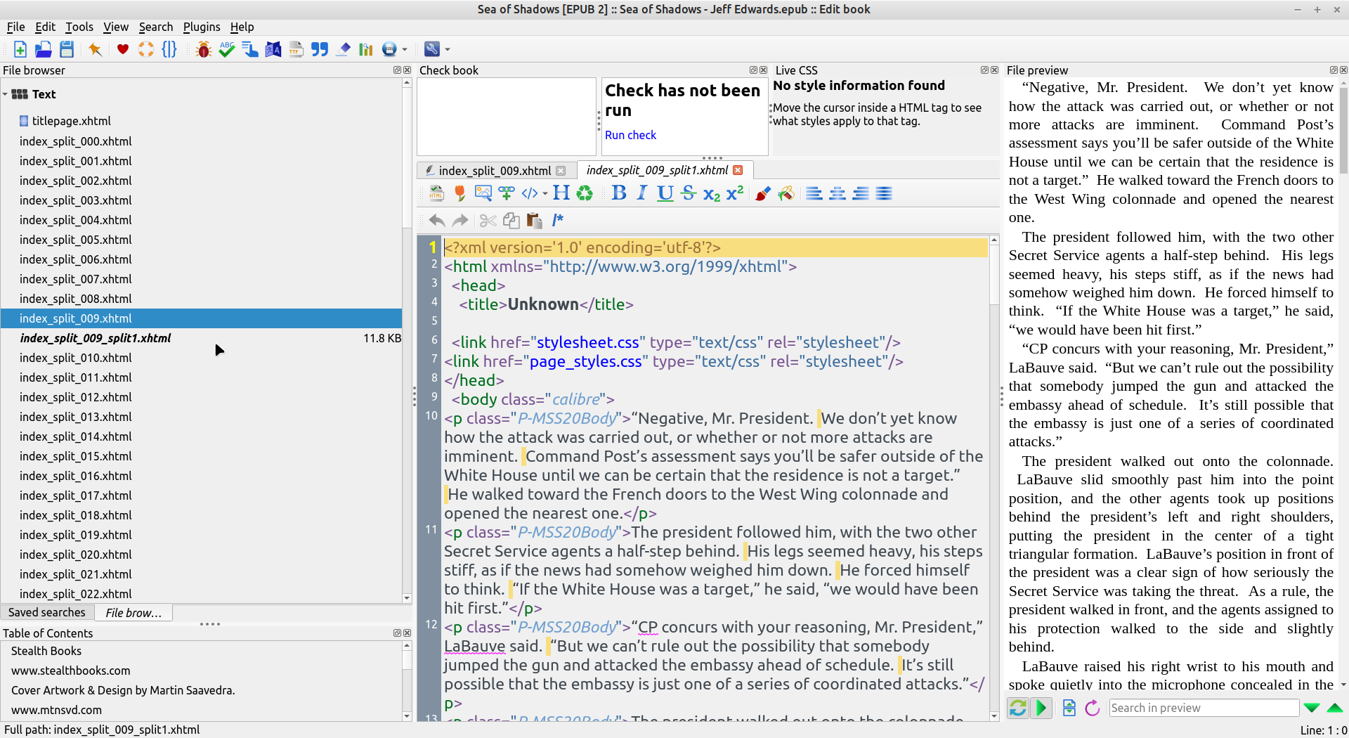 I have a bad mobi source converted to ePub. I want to manually place my cursor at locations in the (7.5mb!) index.html file and split at that point. Because it's a conversion from mobi, I cannot use an xpath expression -- the option offered when placing the cursor where I want to split and then right-clicking -- to tell it where to convert (you really don't want to see some of the goofy code). Neither the Tools nor the Edit menus offer anything other than Split at Multiple Locations. So what am I missing? |