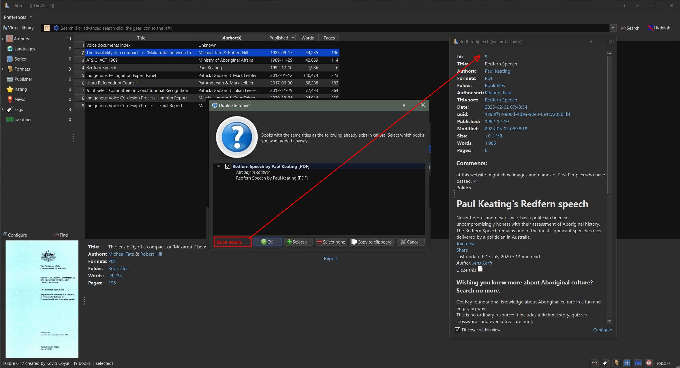 Which gives me an idea of how to give the OP what they want. Added: Here it comes: All that should need behind the Book derails button is one of these: calibre://book-details/_hex_-546865566f696365/9 And now that Book details can be shown for books in another library, the same could be done for Find duplicates->Find Library Duplicates. That would mean @theducks wouldn't have to fossick around in the wood pile, and I wouldn't have fire up CalibreSpy Maybe the button isn't needed, the BD panel could pop automatically for the current duplicate… a show/no-show checkbox in Configure for those who don't want more information. BR Last edited by BetterRed; 05-03-2023 at 01:15 AM. Reason: Added |
