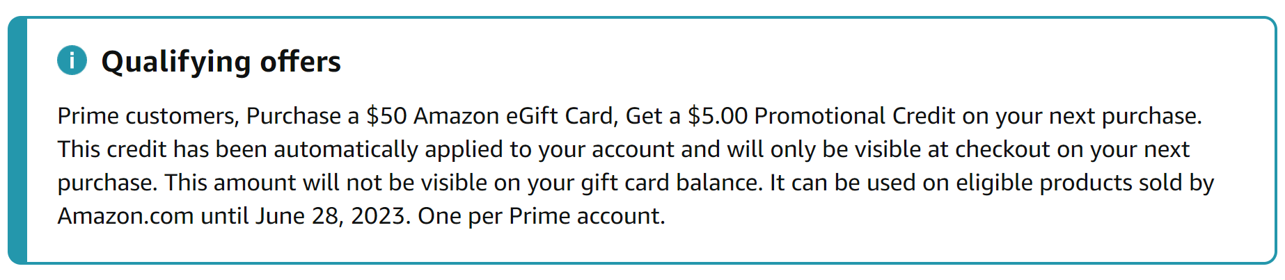 I happened to hover over the Prime tab on my Amazon US home page this morning, and found an offer for a $5 credit if I buy $50 worth of e-gift cards. It's billed as a "Mothers Day" offer, but I don't see any specific time frame actually mentioned.