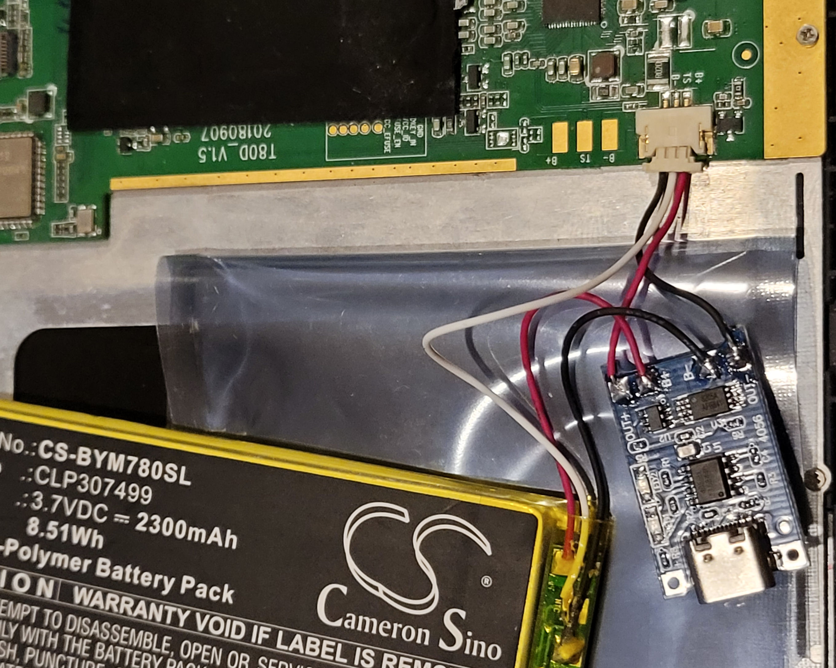 I can provide a working but unfinished solution. However, maybe it is a starting point for a better solution. About one and a half year ago my second Likebook Mars died. I plugged in the charger cable and with a bright white backlight flash, the USB/charger unit died. Because the accu was already on its last legs, I bought a replacement. No charging, no USB connection, but the device started and I could collect data/wipe the device. Back then, I thought about adding a tiny charger unit as well. As you can see from the picture attached, I bought a dirt-cheap TP4056 charger. Attention! There are version to buy without accu protection. My 1.5 years old USB-C version cannot charge with modern USB-C PD chargers due to the missing communication channel. Maybe today there are better TP4056 versions around. This said it looks like the TP4056 is considered as a ‘bad charger unit’ within electric engineering forums which damages the accu over time even with the advertised accu protection. I got the 5V/1A charging version. It does its job: But there is no way you could safely place the tiny board within the Likebook unit. Charging at 1A (My Samsung mobile power supply sucks up around 7W at first.) it way overheats. You cannot touch the charger board. The accu itself keeps cool during the charging process. If you plan to charge with 1A then you should consider to buy additional cable, plugs and a heat sink. You need the heat sink for cooling the TP4056 charger board. Of course, with a heat sink you cannot playe the charger unit within the Likebook Mars housing. Which is why to buy additional cables/plugs/sockets for a external detachable charging solution. Or, if you still plan to house the TP4056 within the Likebook Mars unit, you need to reduce its charging output to 0,3A to reduce overheating. I think this was the Likebook Mars charging current? It is possible by replacing the very tiny SMD capacitor of the TP4056 according it's data sheet with a less powerful SMD capacitor. In the end, I did not like both solutions. Tinkering hassle with external cables and maybe safety reasons with a build in unit (Long charging sessions unsupervised.). In addition, for me holding a 8' device was too heavy. Instead I decided to buy smaller 6' device again, the Reinkstone R1 Reader (I think it is the same as the Meebook M6?!). Bye the way. Maybe I should replace it's accu sooner than later. Because after 1.5 years it is losing capacity. Coincidence or not, both my two Likebook Mars became faulty when their accus have shown age. |