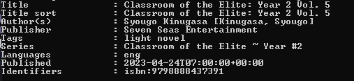 e.g. Book file is Classroom of the Elite ~ Year 2 ~ Volume 05.epub and when it is added to caliber the folder structure created is ...\tmp(ln2)\Syougo Kinugasa\Classroom of the Elite ~ Year 2 ~ v (2681) and the file is renamed to Classroom of the Elite ~ Year 2 - Syougo Kinugasa.epub. ebook-meta returns Series : Classroom of the Elite Year #2 for the series information In caliber if I rename the book to Classroom of the Elite ~ Year Two ~ volume 5, the folder structure becomes ...\tmp(ln2)\Syougo Kinugasa\Classroom of the Elite ~ Year Two ~ (2681) and the file is renamed Classroom of the Elite ~ Year T - Syougo Kinugasa.epub ebook-meta returns no series information. The OPF file in all cases contains no series information and none is stored in metadata.db Last edited by glenm; 09-12-2023 at 07:55 AM. Reason: added more info |