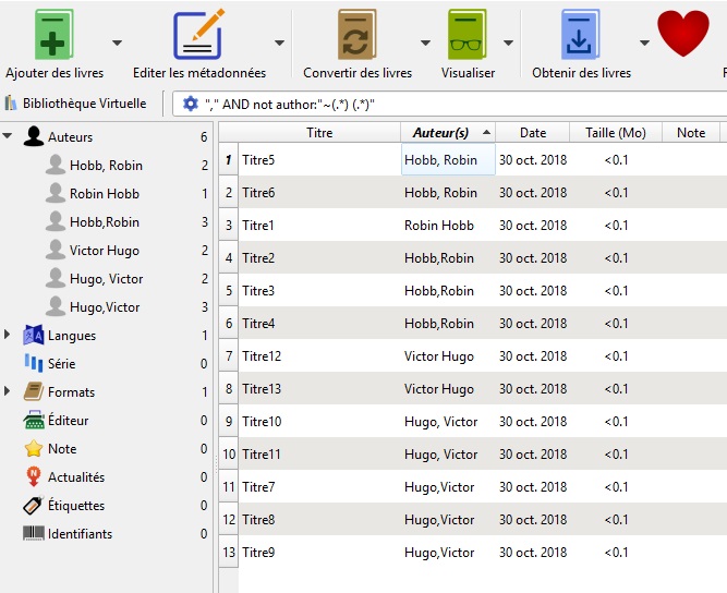 Je vais partir d'un exemple concret (Capture 1) avec 2 auteurs : Robin Hobb et Victor Hugo. Plusieurs possibilités 1 - Renommer l'auteur dans le volet latéral gauche : click droit sur l'auteur (capture 2) 2 - Sélectionner les livres d'un auteur -> click droit -> Editer les métadonnées par lot -> renseigner l'auteur -> OK (captures 3 et 4) 3 - Utiliser les expressions régulières : voir le tuto en français http://tutocalibre.free.fr/tuto_harmonisation.php 3.1 - Remplacer Hobb,Robin et Hugo,Victor par Hobb, Robin et Hugo, Victor (ajout d'un blanc après la virgule) Mettre dans la barre de recherche author: "," AND not author:"~(.*) (.*)" (capture 5) puis Rechercher (capture 6) Sélectionner tous les livres obtenus -> click droit -> Editer les métadonnées par lot (capture 7) Onglet 'Rechercher et remplacer' Dans 'type de recherche' sélectionner 'Expression régulière' Champ de recherche : authors Rechercher : (.*),(.*) Remplacer par : \1, \2 Champ de destination : authors (capture 8). Bien respecter la syntaxe dans les champs Rechercher et Remplacer par. A noter que le résultat obtenu est prévisualisé dans la colonne 'Tester le résultat' OK => repmlacement effectué (capture 9) 3.2 - Remplacer Hobb, Robin et Hugo, Victor par Robin Hobb et Victor Hugo Même principe que précédemment avec : Mettre dans la barre de recherche author: authors:", " (capture 10) et dans l'onglet 'Rechercher et remplacer' Rechercher : (.*),(.*) Remplacer par : \2 \1 (capture 11) Ok => (capture 12) De nombreux autres exemples d'harmonisation de la bibliothèque sont décrites dans le tuto 4 - Ajustement dans le volet latéral gauche L'affichage par défaut est par (prénom nom) des auteurs triés sur le nom. On peut préférer un affichage par clé de tri des auteurs (nom, prénom). Pour ce faire : icône 'Préférences' -> Ajustements (capture 13) Comme proposé remplacer categories_use_field_for_author_name = 'author' par categories_use_field_for_author_name = 'author_sort' Click sur 'appliquer les changements à cet ajustement' -> Appliquer -> Redémarrer Calibre (capture 14) Résultat obtenu (capture 15) |