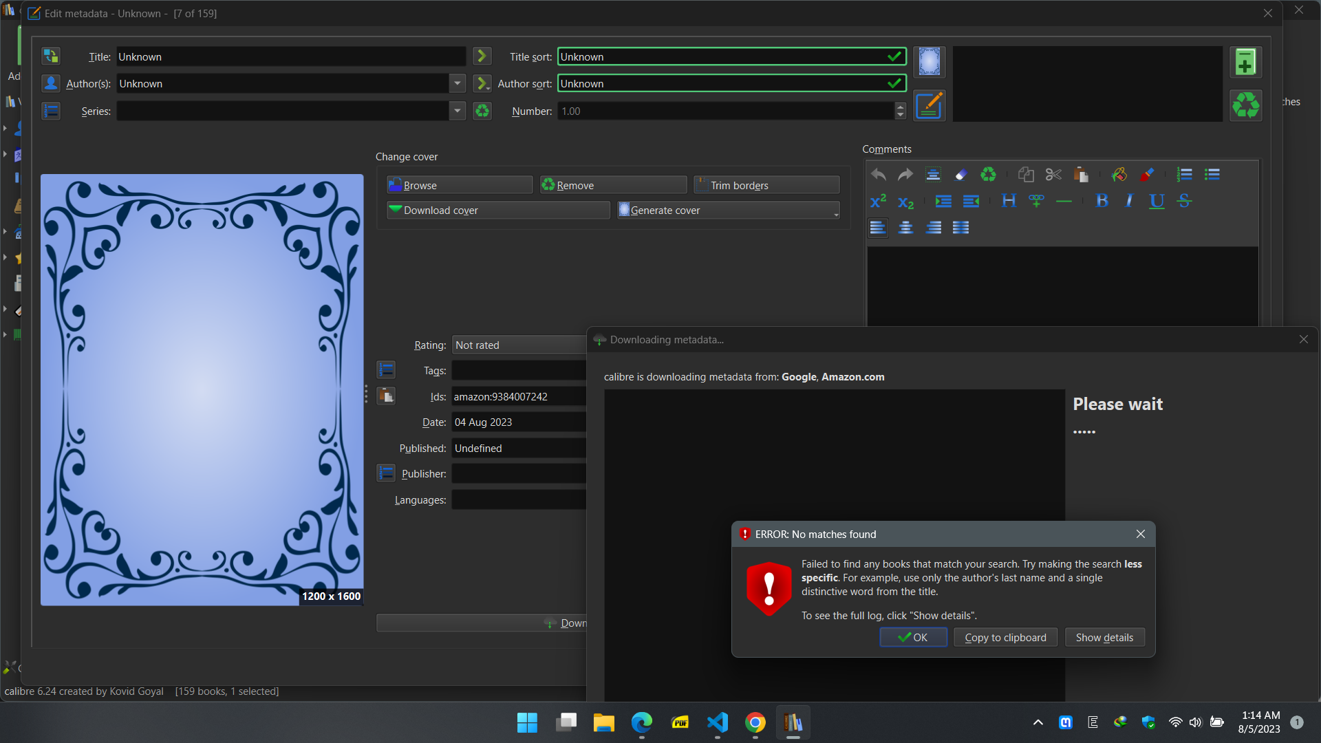 What if you removed the ISBN and all other data and added amazon:9384007242. I found it important that when trying to search using Amazon or ISBN ID's, that all other data fields are empty. Does that work? Last edited by Karellen; 08-04-2023 at 08:15 PM. |