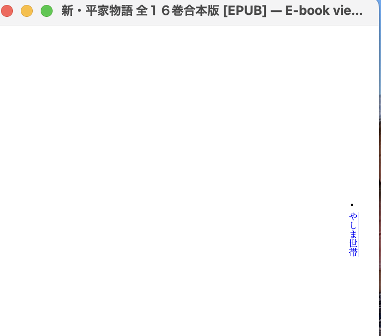 Convert book 1 of 1 (新・平家物語 全16巻合本版) Blacklisting the DeDRM plugin as it is too old and causes crashes Conversion options changed from defaults: margin_left: 0.0 verbose: 2 margin_top: 0.0 cover: '/var/folders/n6/9wfqlx8s68782w34_blmr4400000gq/C/calibre_6.24.0_tmp_6py2u6f5/a08n8fan.jpeg' margin_right: 0.0 max_toc_links: 1000 no_chapters_in_toc: True read_metadata_from_opf: '/var/folders/n6/9wfqlx8s68782w34_blmr4400000gq/C/calibre_6.24.0_tmp_6py2u6f5/x5ycl184.opf' output_profile: 'ipad3' margin_bottom: 0.0 Resolved conversion options calibre version: 6.24.0 {'asciiize': False, 'author_sort': None, 'authors': None, 'base_font_size': 0.0, 'book_producer': None, 'change_justification': 'original', 'chapter': "//*[((name()='h1' or name()='h2') and re:test(., " "'\\s*((chapter|book|section|part)\\s+)|((prolog|p rologue|epilogue)(\\s+|$))', " "'i')) or @class = 'chapter']", 'chapter_mark': 'pagebreak', 'comments': None, 'cover': '/var/folders/n6/9wfqlx8s68782w34_blmr4400000gq/C/calibre_6.24.0_tmp_6py2u6f5/a08n8fan.jpeg', 'debug_pipeline': None, 'dehyphenate': True, 'delete_blank_paragraphs': True, 'disable_font_rescaling': False, 'dont_split_on_page_breaks': False, 'duplicate_links_in_toc': False, 'embed_all_fonts': False, 'embed_font_family': None, 'enable_heuristics': False, 'epub_flatten': False, 'epub_inline_toc': False, 'epub_max_image_size': 'none', 'epub_toc_at_end': False, 'epub_version': '2', 'expand_css': False, 'extra_css': None, 'extract_to': None, 'filter_css': '', 'fix_indents': True, 'flow_size': 260, 'font_size_mapping': None, 'format_scene_breaks': True, 'html_unwrap_factor': 0.4, 'input_encoding': None, 'input_profile': <calibre.customize.profiles.InputProfile object at 0x11672b6a0>, 'insert_blank_line': False, 'insert_blank_line_size': 0.5, 'insert_metadata': False, 'isbn': None, 'italicize_common_cases': True, 'keep_ligatures': False, 'language': None, 'level1_toc': None, 'level2_toc': None, 'level3_toc': None, 'line_height': 0.0, 'linearize_tables': False, 'margin_bottom': 0.0, 'margin_left': 0.0, 'margin_right': 0.0, 'margin_top': 0.0, 'markup_chapter_headings': True, 'max_toc_links': 1000, 'minimum_line_height': 120.0, 'no_chapters_in_toc': True, 'no_default_epub_cover': False, 'no_inline_navbars': False, 'no_svg_cover': False, 'output_profile': <calibre.customize.profiles.iPad3Output object at 0x11672b250>, 'page_breaks_before': "//*[name()='h1' or name()='h2']", 'prefer_metadata_cover': False, 'preserve_cover_aspect_ratio': False, 'pretty_print': True, 'pubdate': None, 'publisher': None, 'rating': None, 'read_metadata_from_opf': '/var/folders/n6/9wfqlx8s68782w34_blmr4400000gq/C/calibre_6.24.0_tmp_6py2u6f5/x5ycl184.opf', 'remove_fake_margins': True, 'remove_first_image': False, 'remove_paragraph_spacing': False, 'remove_paragraph_spacing_indent_size': 1.5, 'renumber_headings': True, 'replace_scene_breaks': '', 'search_replace': '[]', 'series': None, 'series_index': None, 'smarten_punctuation': False, 'sr1_replace': None, 'sr1_search': None, 'sr2_replace': None, 'sr2_search': None, 'sr3_replace': None, 'sr3_search': None, 'start_reading_at': None, 'subset_embedded_fonts': False, 'tags': None, 'timestamp': None, 'title': None, 'title_sort': None, 'toc_filter': None, 'toc_threshold': 6, 'toc_title': None, 'transform_css_rules': '[]', 'transform_html_rules': '[]', 'unsmarten_punctuation': False, 'unwrap_lines': True, 'use_auto_toc': False, 'verbose': 2} InputFormatPlugin: MOBI Input running on /var/folders/n6/9wfqlx8s68782w34_blmr4400000gq/C/calibre_6.24.0_tmp_6py2u6f5/wykyz_sx.azw3 Found KF8 MOBI of type 'standalone' Extracting text... Parsing all content... Parsing text/part0078.html ... Parsing text/part0222.html ... Parsing text/part0226.html ... Parsing text/part0441.html ... Parsing text/part0040.html ... Parsing text/part0108.html ... Parsing text/part0278.html ... Parsing text/part0639.html ... Parsing text/part0792.html ... Parsing text/part0378.html ... Parsing text/part0804.html ... Parsing text/part0290.html ... Parsing text/part0498.html ... Parsing text/part0142.html ... Parsing text/part0227.html ... Parsing text/part0216.html ... Parsing text/part0559.html ... Parsing text/part0554.html ... Parsing text/part0258.html ... Parsing text/part0281.html ... Parsing text/part0747.html ... Parsing text/part0423.html ... Parsing text/part0594.html ... Parsing text/part0286.html ... Parsing text/part0360.html ... Parsing text/part0482.html ... Parsing text/part0682.html ... Parsing text/part0534.html ... Parsing text/part0470.html ... Parsing text/part0536.html ... Parsing text/part0254.html ... Parsing text/part0232.html ... Parsing text/part0253.html ... Parsing text/part0507.html ... Parsing text/part0677.html ... Parsing text/part0201.html ... Parsing text/part0582.html ... Parsing text/part0676.html ... Parsing text/part0011.html ... Parsing text/part0410.html ... Parsing text/part0667.html ... Parsing text/part0370.html ... Parsing text/part0782.html ... Parsing text/part0141.html ... Parsing text/part0728.html ... Parsing text/part0129.html ... Parsing text/part0217.html ... Parsing text/part0107.html ... Parsing text/part0785.html ... Parsing text/part0532.html ... Parsing text/part0512.html ... Parsing text/part0362.html ... Parsing text/part0095.html ... Parsing text/part0109.html ... Parsing text/part0387.html ... Parsing text/part0608.html ... Parsing text/part0794.html ... Parsing text/part0317.html ... Parsing text/part0073.html ... Parsing text/part0081.html ... Parsing text/part0730.html ... Parsing text/part0528.html ... Parsing text/part0006.html ... Parsing text/part0021.html ... Parsing text/part0523.html ... Parsing text/part0259.html ... Parsing text/part0741.html ... Parsing text/part0320.html ... Parsing text/part0746.html ... Parsing text/part0157.html ... Parsing text/part0698.html ... Parsing text/part0651.html ... Parsing text/part0428.html ... Parsing text/part0363.html ... Parsing text/part0504.html ... Parsing text/p