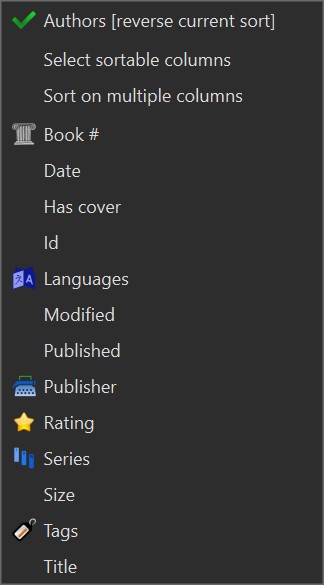 Sort by allows sorting on columns you can't see. Its default short cut is Ctrl+F5, and/or you can add it to a menu/toolbar. @chaley - provide a "Disable column sorting with mouse clicks" checkbox setting in Preferences->Sorting. The only time I 'use' left mouse click sorting is when I miss with a left click on a VL tab.BR |