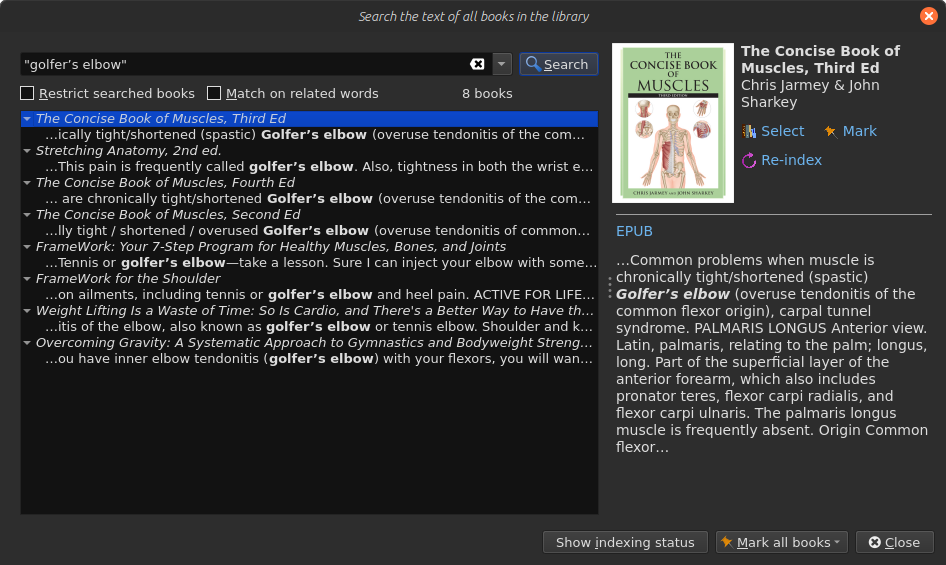 Actually, I learned that full-text search, at least in phrases, does support punctuation. But I'm getting ahead of myself. Let's rewind. FT Search couldn't find any books with "golfer's elbow" But it found eight books when it was a curly (a.k.a "smart) apostrophe, as in: "golfer’s elbow" |